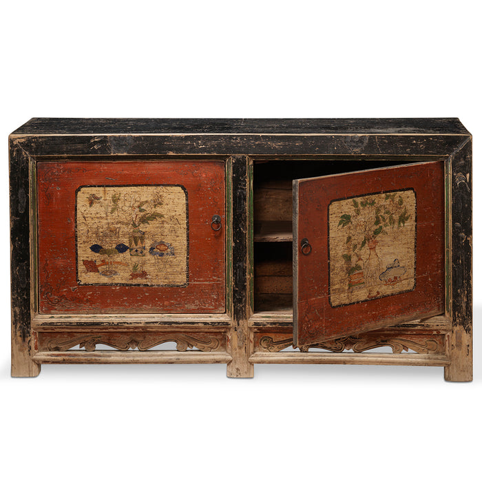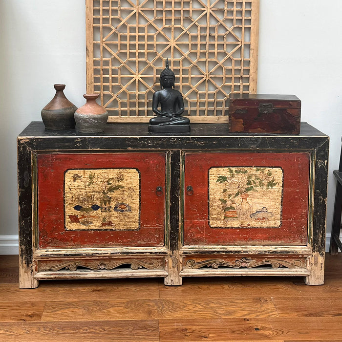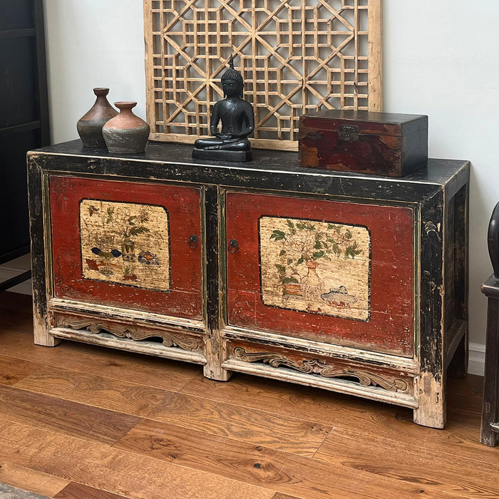 Ce buffet est assez typique des coffres à grains utilisés dans la partie orientale de la province chinoise du Gansu, avec des couleurs crème et rouges sur les portes contrastant avec les cadres extérieurs noirs. Des coffres comme celui-ci seraient normalement fabriqués en bois de pin ou, comme dans ce cas, en bois de peuplier. Celui-ci date de la fin du XIXe siècle et ferait aujourd'hui un très joli buffet de salle à manger ou un meuble de rangement. Lors de sa fabrication initiale, les panneaux avant auraient été fixes, l'intérieur du coffre étant accessible via des planches de bois amovibles situées sur le dessus. Ceux-ci ont été scellés et les panneaux avant transformés en portes pour créer un buffet plus pratique, avec des étagères amovibles installées à l'intérieur.