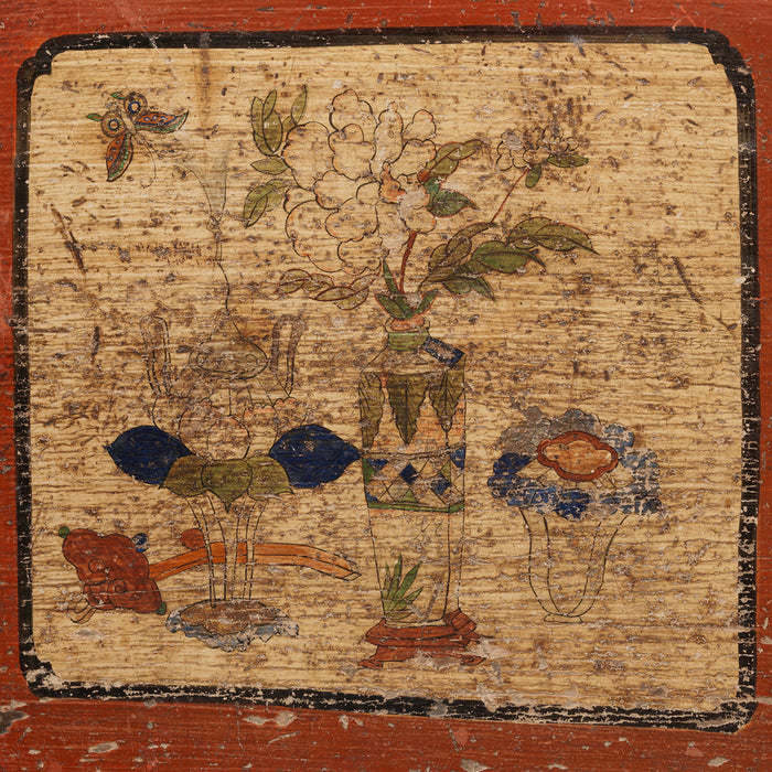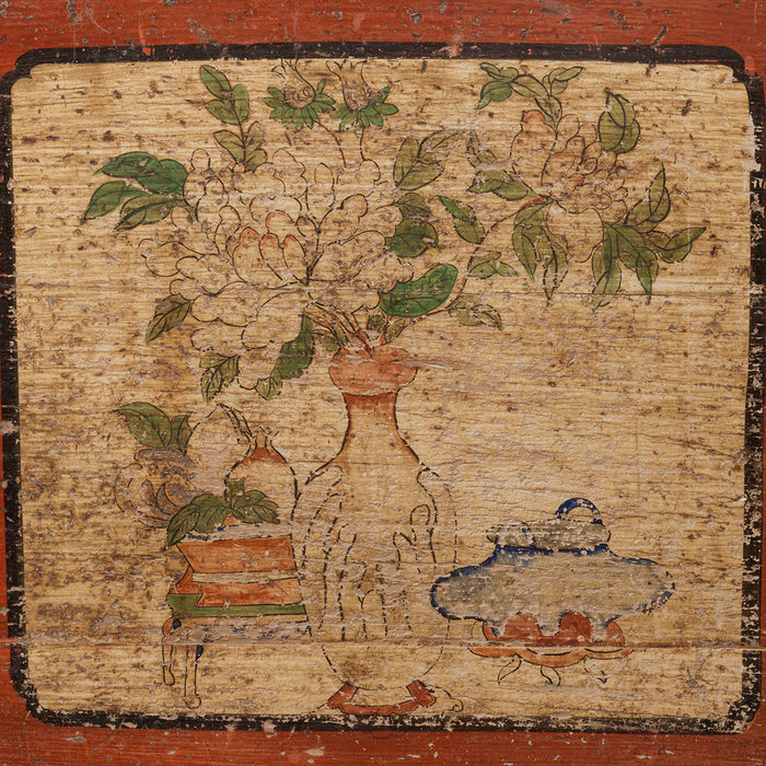 Les sections peintes de forme carrée sur les portes montrent des vases de fleurs et d'autres objets personnels de valeur choisis sur le fond crème. Il s’agissait d’un thème typique utilisé pour décorer ce type de coffre de rangement et destiné à montrer la richesse et l’importance du propriétaire. Ici, les panneaux inférieurs sont sculptés pour ajouter une touche supplémentaire au design. La laque de ces sections sculptées, autrefois également rouge vif, s'est usée jusqu'au bois plus pâle, tout comme la laque noire autour des pieds. La finition laquée noire sur la surface supérieure est encore en grande partie intacte, bien que marquée et usée au fil des années d'utilisation pour créer un caractère unique.