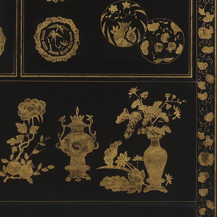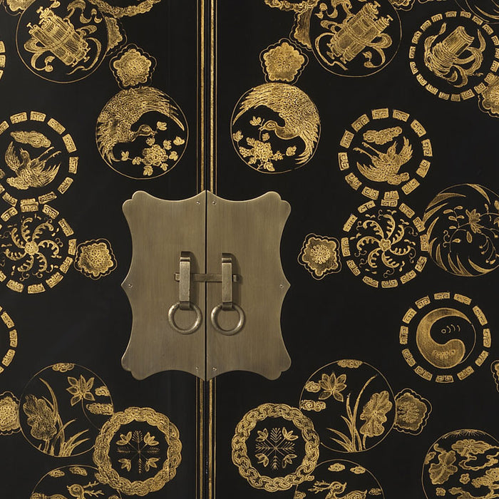 Vu ici dans notre superbe laque noire et décoré d'un motif traditionnel en feuille d'or représentant des fleurs et des animaux, ce meuble est une reproduction de pièces généralement produites dans la province du Shanxi, en Chine centrale, depuis des centaines d'années et comprend des ferrures en laiton façonnées sur les portes. Les armoires de mariage comme celle-ci étaient traditionnellement offertes dans le cadre de la dot de la mariée chinoise, avec les vêtements, les soieries et les tissus qui y étaient stockés. Comme c'était la pratique dans toute la Chine où les vêtements étaient pliés à l'intérieur des armoires plutôt que suspendus sur des rails, notre armoire comprend une étagère fixe à l'intérieur avec deux petits tiroirs ainsi que deux étagères amovibles supplémentaires. Une autre étagère amovible cache un compartiment « secret » derrière le panneau inférieur. Idéal comme meuble à boissons, pour une télévision ou pour un rangement général dans une salle de réception ou une chambre. Si vous préférez qu'une tringle de suspension soit installée pour utiliser le meuble comme armoire, veuillez nous le faire savoir et nous pourrons organiser cela. Notez que chaque pièce est décorée individuellement à la main et que les motifs peuvent donc varier légèrement par rapport aux exemples présentés. Également disponible en laque rouge. D'autres couleurs peuvent être réalisées sur commande.