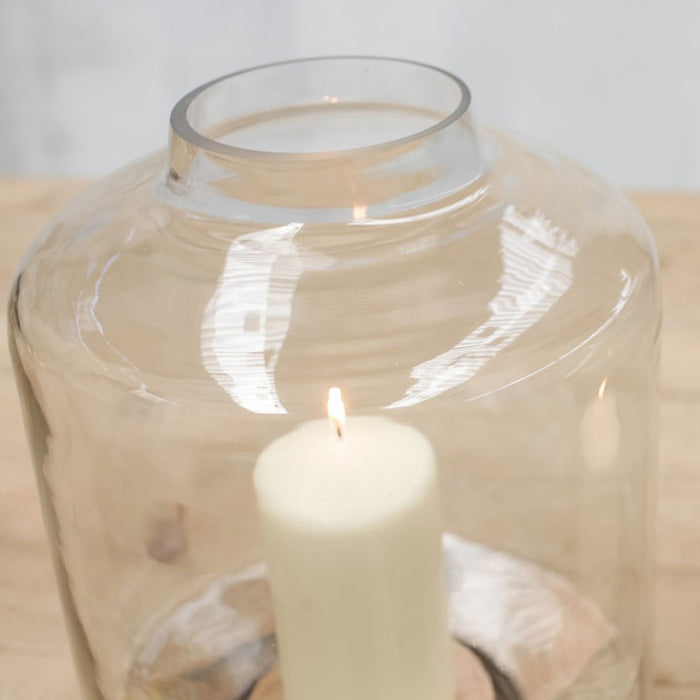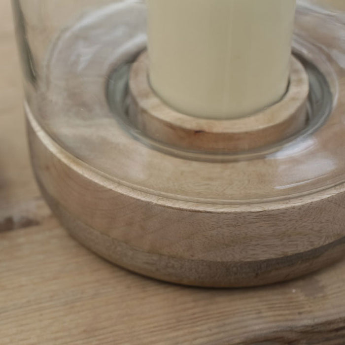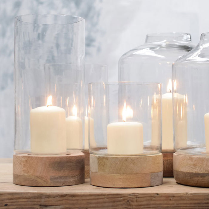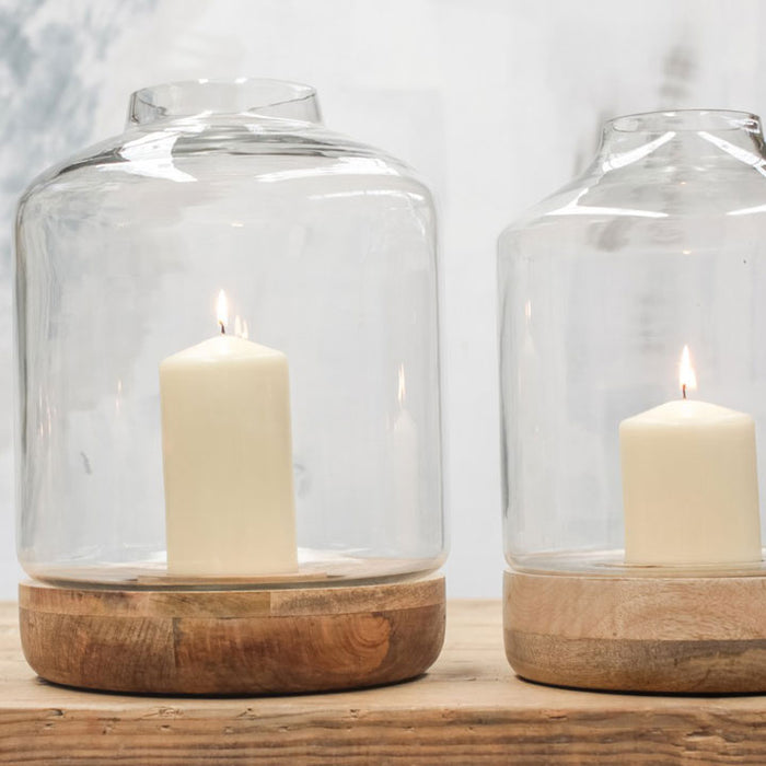 Ces jolies lanternes ouragan sont disponibles en deux tailles. Les couvercles en verre transparent sont effilés en haut et sont fabriqués à partir de verre recyclé. Ils reposent sur des bases en bois de manguier durable. Idéal pour une utilisation sur un buffet ou une table à manger. Ils peuvent également être utilisés à l’extérieur (mais rentrez-les à l’intérieur lorsqu’ils ne sont pas utilisés).