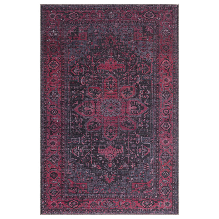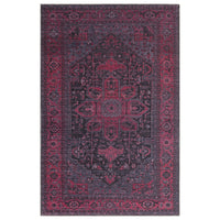 Le design traditionnel de ce tapis Alya fait une déclaration audacieuse avec son mélange de rouges fuschia et de roses ainsi qu'un fond central noir.