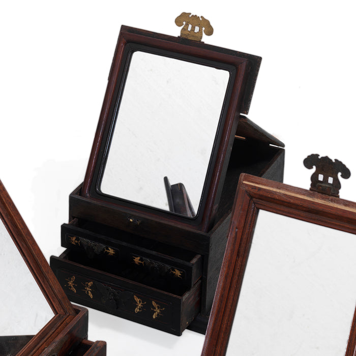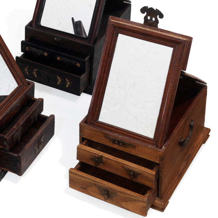 Ces caisses en bois fabriquées à la main proviennent de la province du Jiangsu, produites à proximité des villes de Shanghai et Suzhou. Ils s'ouvrent pour révéler un miroir complet et plusieurs tiroirs, offrant du rangement pour de petits objets, notamment des bijoux, des perles, des broches et des cosmétiques. La conception soignée permet aux boîtes de se plier dans une taille compacte pour un rangement ou un transport simple. Dotées de quincaillerie en laiton d'origine, de charnières et, dans certains cas, d'incrustations décoratives en os, ces boîtes servent aujourd'hui de coffrets à bijoux ou cadeaux.