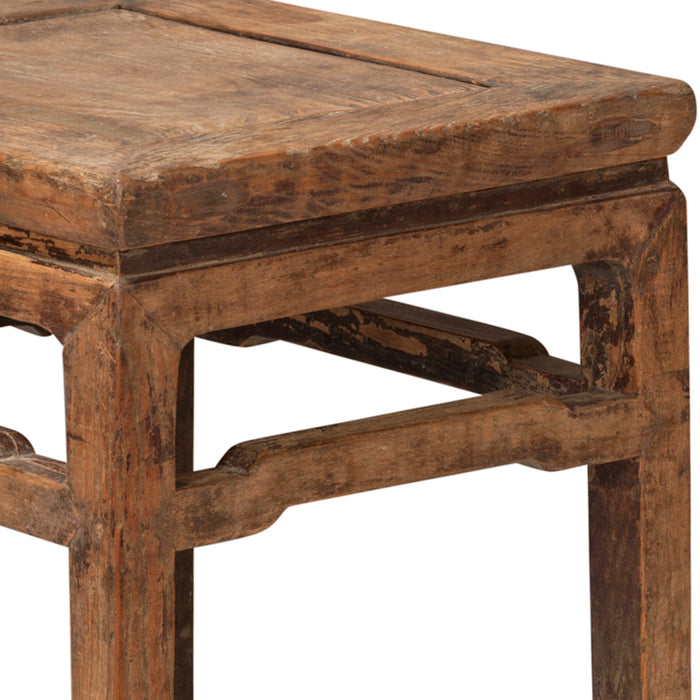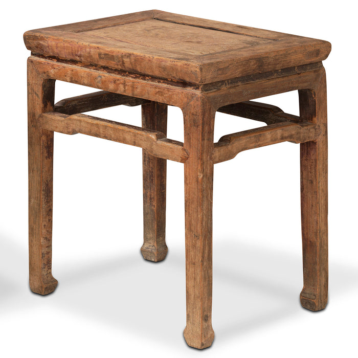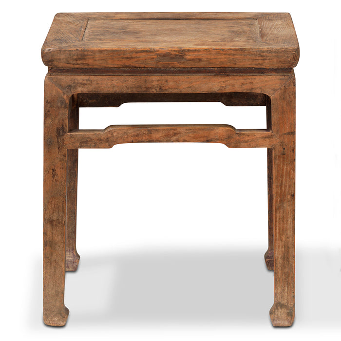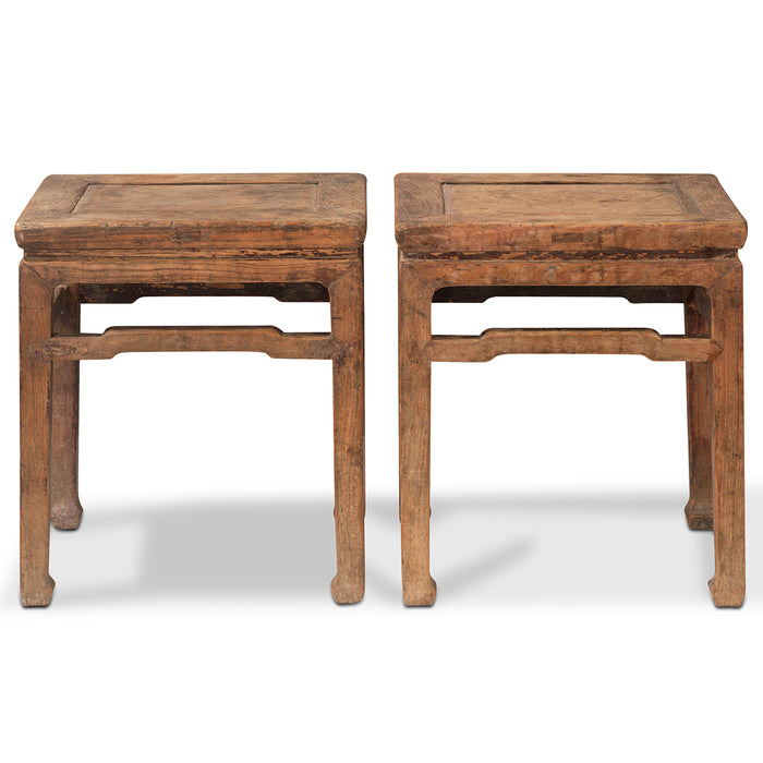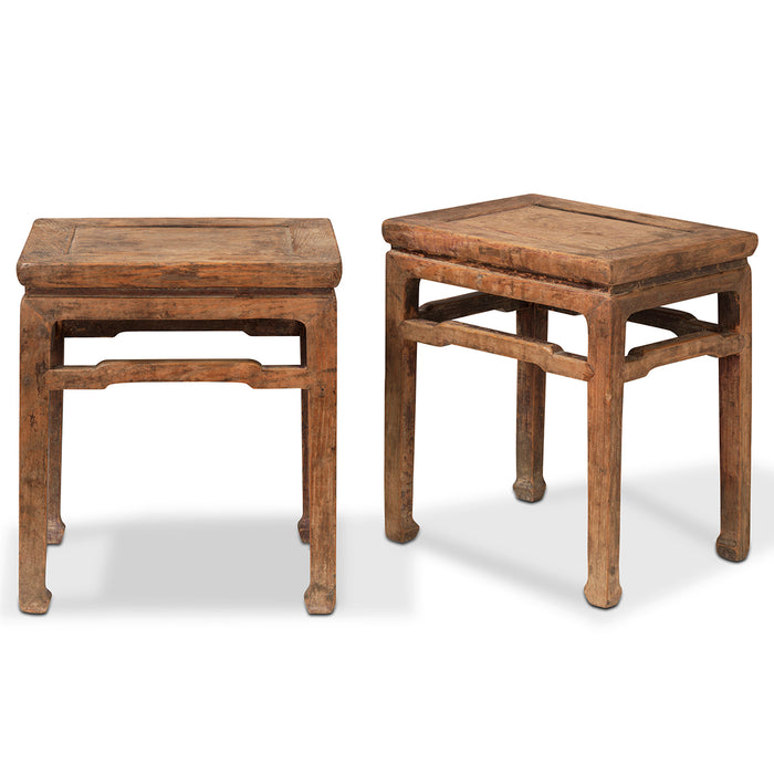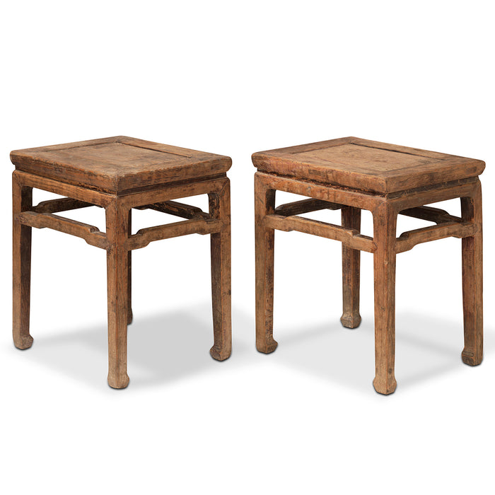 Ces tabourets en orme ont été fabriqués à la main à Pékin et présentent un grain de bois naturel mis en valeur par une finition poncée. Les cadres robustes et le design chinois traditionnel, y compris les sièges à taille, les pieds en forme de sabot de cheval et les civières en forme de S placées haut entre les jambes, les rendent à la fois fonctionnels et visuellement attrayants. Magnifiquement proportionnés et dans un style emblématique, ces tabourets sont parfaits pour des sièges supplémentaires ou comme tables d'appoint polyvalentes. Vendus par paire, le prix indiqué correspond aux deux tabourets.