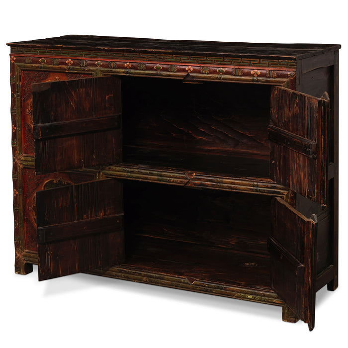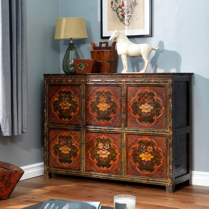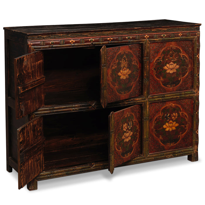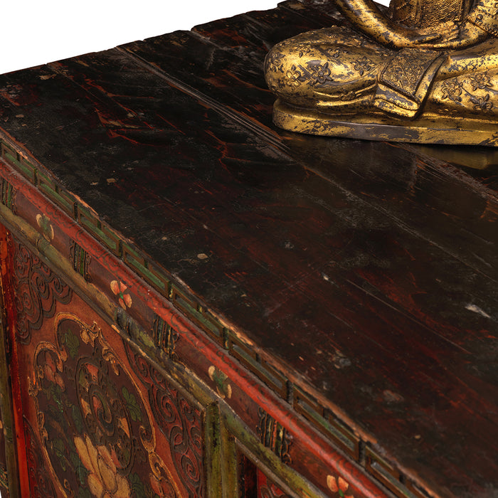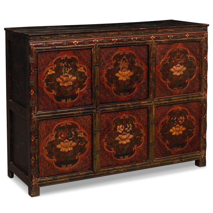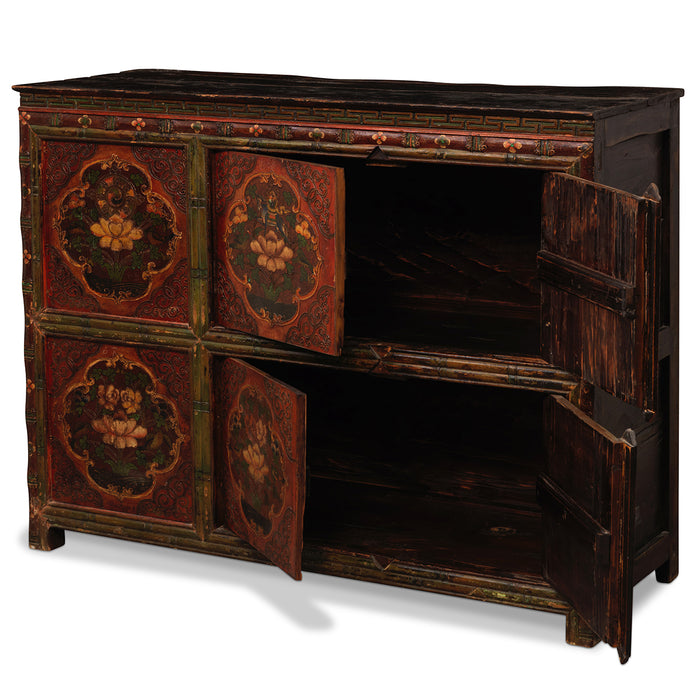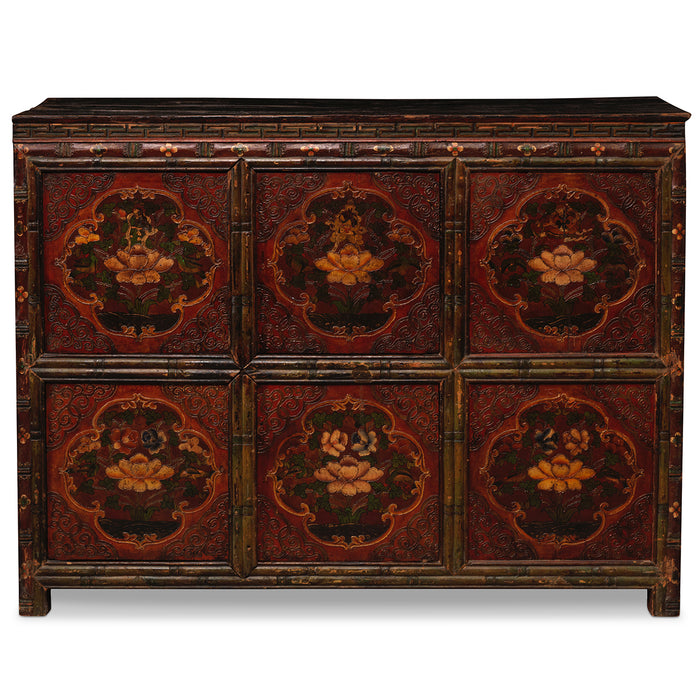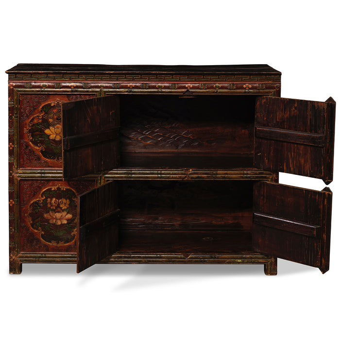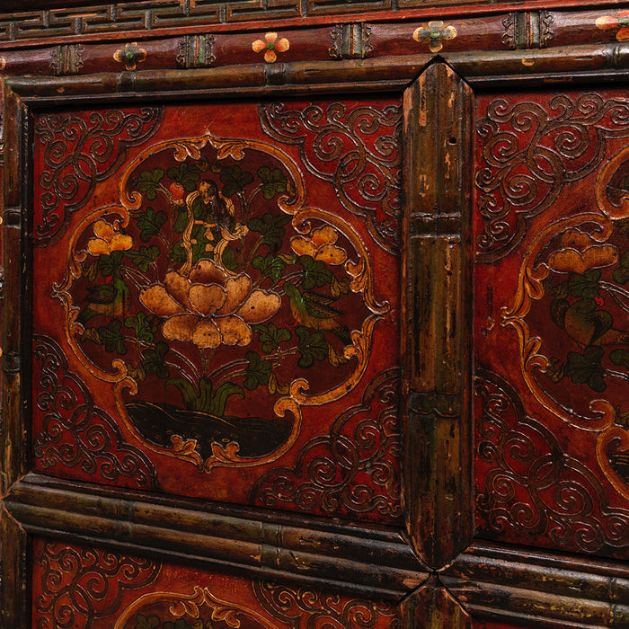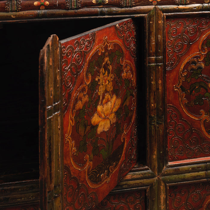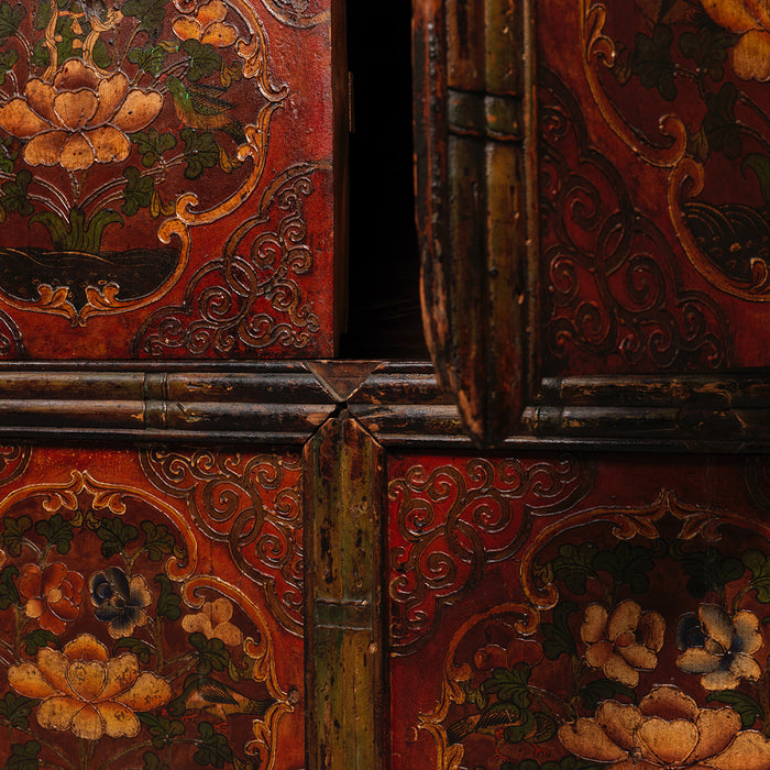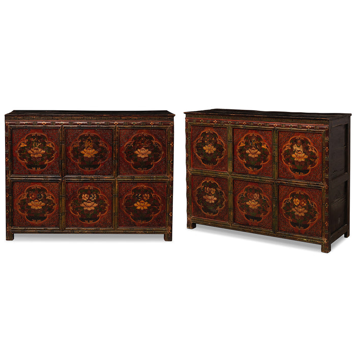 Ces superbes armoires ont été produites au Tibet vers le début du XXe siècle. Comme la plupart des meubles tibétains, ils sont fabriqués en pin, magnifiquement peints dans une palette typique de verts, jaunes, bleus et oranges. Les couleurs auraient été autrefois plus vives, mais elles se sont désormais adoucies pour devenir des teintes automnales plus douces. De telles armoires étaient souvent produites par paires et auraient été utilisées pour stocker des robes de cérémonie, des parchemins et des documents importants ou même le beurre de yack utilisé dans les lampes.