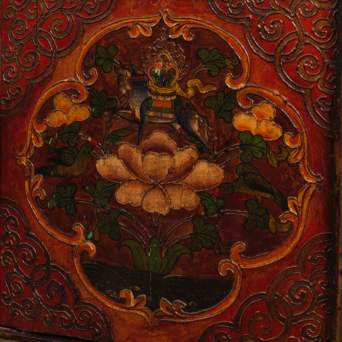 Au-dessus de chaque fleur de lotus, sur les panneaux supérieurs de chaque armoire, se trouve un symbole distinct et individuel. La première armoire montre un éléphant en haut à droite, l'un des symboles les plus importants du bouddhisme et un signe de force, d'honneur et de sagesse. L'éléphant blanc en particulier est également associé à la divinité et à la paix. À côté, au centre, se trouve un mythique « Cheval du vent », un symbole souvent vu sur les drapeaux de prières tibétains pour transporter les prières vers les cieux et également censé apporter la bonne fortune. Enfin, à gauche se trouve une roue du dharma, l’un des plus anciens symboles bouddhistes. Cela représente le processus de mort et de renaissance et la libération éventuelle de ce cycle sans fin grâce à l'illumination.