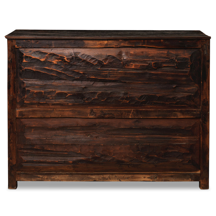 Sur chaque meuble sont fixés deux des panneaux extérieurs (respectivement à gauche et à droite), tandis que les autres s'ouvrent comme des portes pour donner accès à tout l'intérieur. Une seule étagère se trouve à mi-hauteur. Le dessus de chaque armoire est dans la finition noire d'origine - maintenant portée sur le bois de pin rustique pour donner une merveilleuse patine vieillie. L'arrière de chaque unité est en pin épais et trapu, fini dans une teinture pour bois foncé. En règle générale, les armoires sont assez basiques dans leur construction mais sont joliment décorées. Il est désormais rare de trouver des meubles tibétains dans leur état d'origine et encore avec les peintures anciennes, notamment une paire assortie comme celle-ci. Ils apporteraient de la vraie couleur, de l'histoire et du caractère à n'importe quel intérieur.