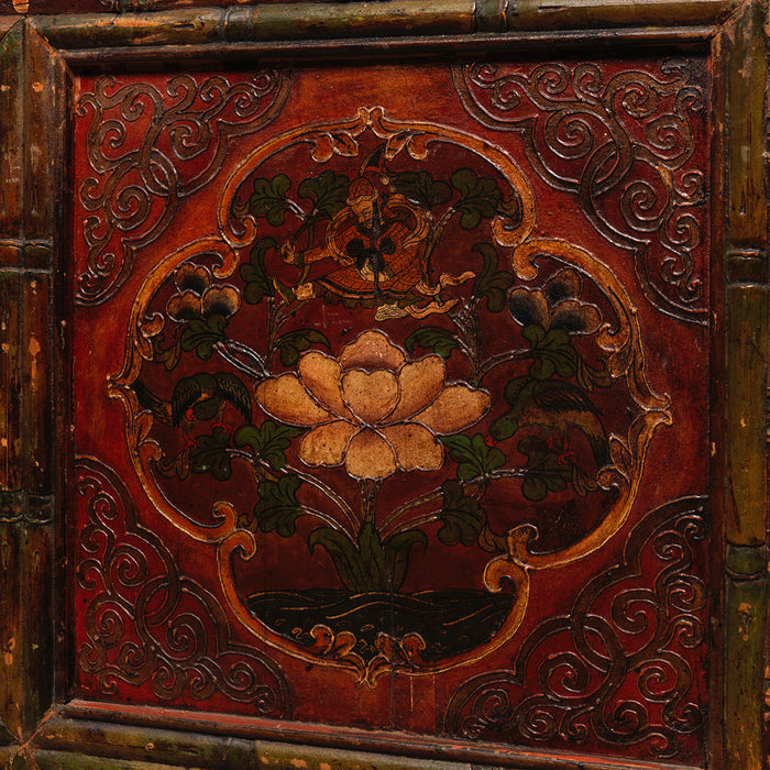 Comme c'était l'habitude, les peintures ici comprennent plusieurs symboles religieux importants dans le bouddhisme. Les cadres verts qui entourent chacun des six panneaux peints sont sculptés pour ressembler à du bambou. Vénéré pour sa force et sa flexibilité, le bambou est associé à l’illumination, qui nécessite également une grande persévérance et une grande capacité d’adaptation pour y parvenir. Les six panneaux eux-mêmes montrent chacun une fleur de lotus placée au milieu d’un contour floral. Le lotus est un symbole de l'éveil et de la pureté du Bouddha, un rappel que tous les êtres sont capables d'atteindre l'illumination.