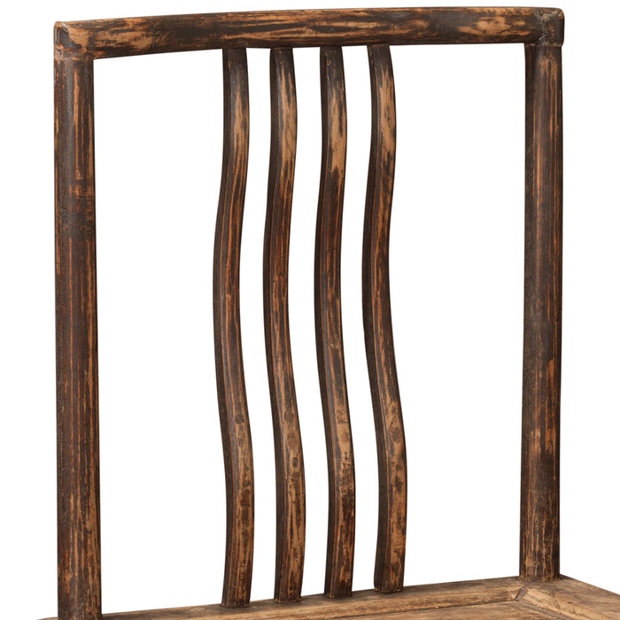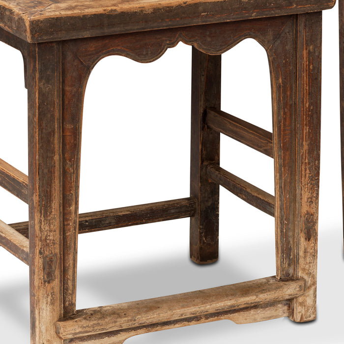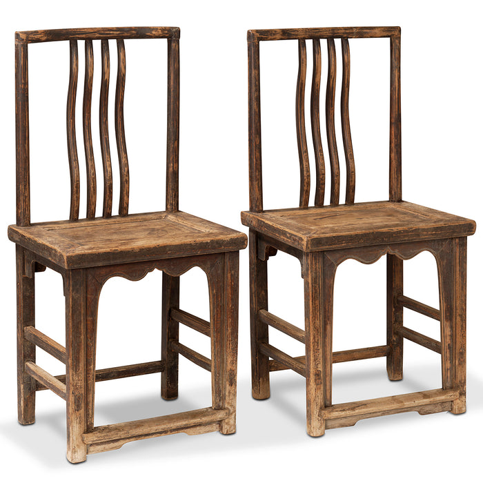 Ces élégantes chaises d'appoint antiques sont fabriquées à partir de bois d'orme et présentent une belle patine, en particulier sur les sièges, où la finition sombre d'origine s'est usée pour laisser place à la couleur plus naturelle du bois en dessous. Les rails supérieurs sont assemblés au ras des montants latéraux arrondis dans un style « officiel du Sud », mais les protections arrière sont généralement constituées de quatre montants arrondis plutôt que d'un seul support plat plus large. Chaque chaise est dotée de doubles renforts sur les côtés et d'un repose-pieds avant, ainsi que de tabliers avant incurvés sous les sièges. Vendues par paire, le prix indiqué correspond aux deux chaises.