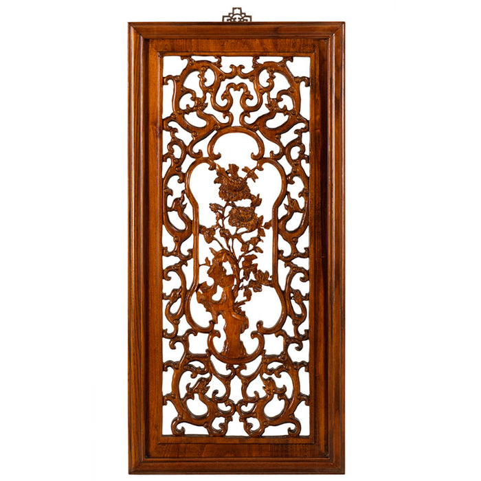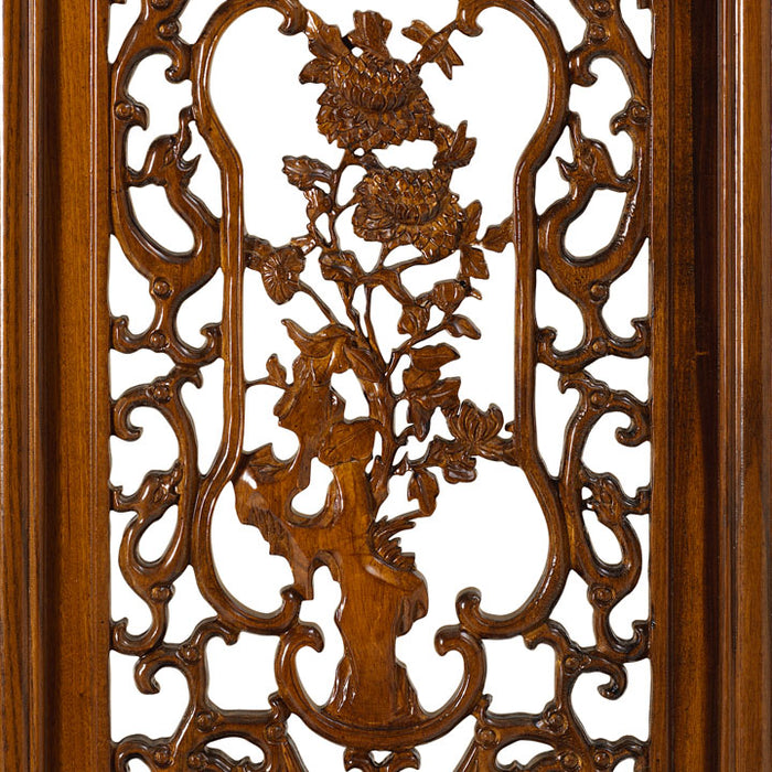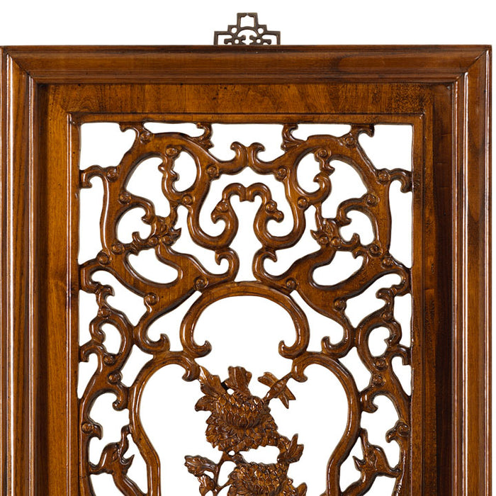 Notre panneau en bois massif, ici fini dans notre orme chaud, est une représentation de l'un des « Quatre Nobles », la sculpture située au centre est entourée de dragons à volutes et représente des chrysanthèmes, un ancien symbole d'humilité, elle est fabriquée à partir de camphre, un bois facile à sculpter. Le cadre extérieur est en bois de sapin. Les panneaux peuvent être achetés individuellement ou par lot de quatre.