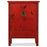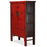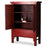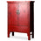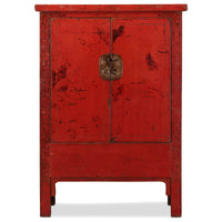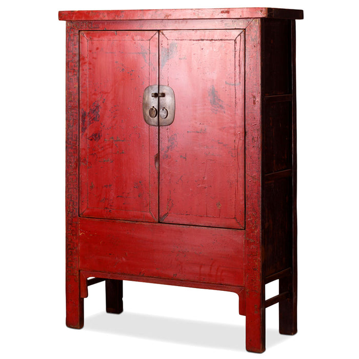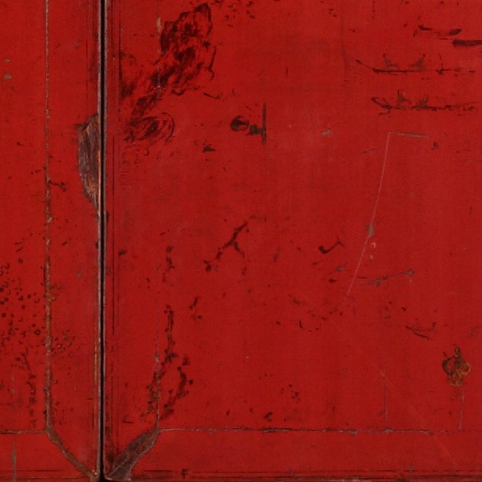 Cette armoire ancienne est toujours dans sa couleur rouge cinabre d'origine. Les peintures sur les portes et le panneau fixe inférieur étaient autrefois en or brillant, la feuille d'or étant appliquée à la main selon un processus appelé « miao jin ». L’or s’est en grande partie usé pour ne laisser apparaître que la base sombre en dessous, ne laissant que de subtiles traces des anciennes peintures de paysages. Le motif de défilement le long des cadres extérieurs est légèrement plus clair, ainsi que le détail des fleurs sur le devant du haut allongé. Les portes s'insèrent directement dans les cadres des armoires sur des charnières en bois, offrant ainsi une toile plus grande pour la décoration peinte. Comme c'était la tradition, le meuble aurait très probablement été présenté dans le cadre des célébrations d'un mariage, le rouge et l'or étant considérés comme les couleurs les plus chanceuses pour les mariés. Il y a deux étagères amovibles à l'intérieur qui ont été ajoutées récemment, ainsi qu'une planche amovible au-dessus du compartiment inférieur.