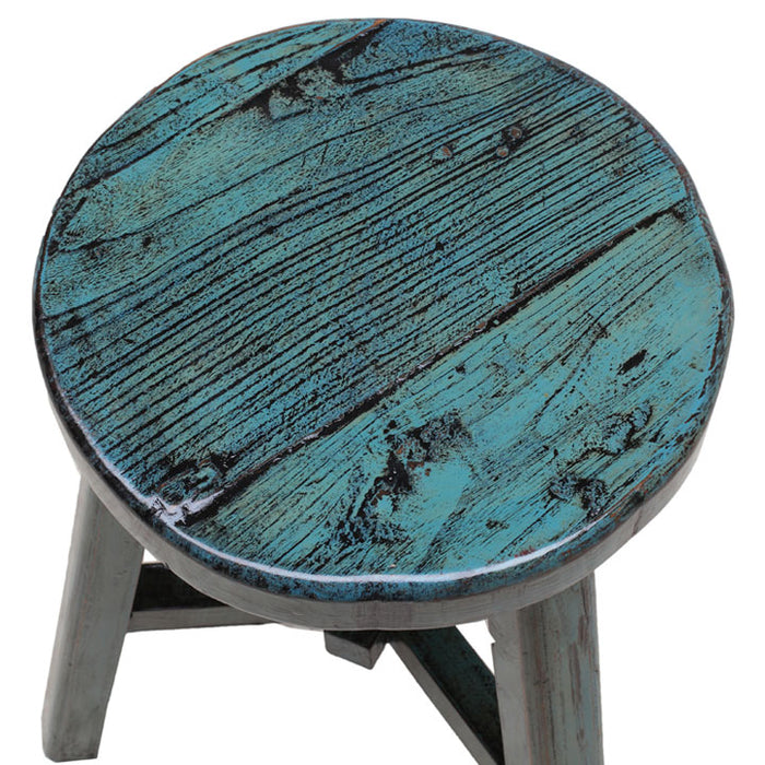Ce petit tabouret à trois pieds est un design chinois classique, revisité avec une laque bleue vieillie. Idéal pour s'asseoir occasionnellement ou comme petite table d'appoint.