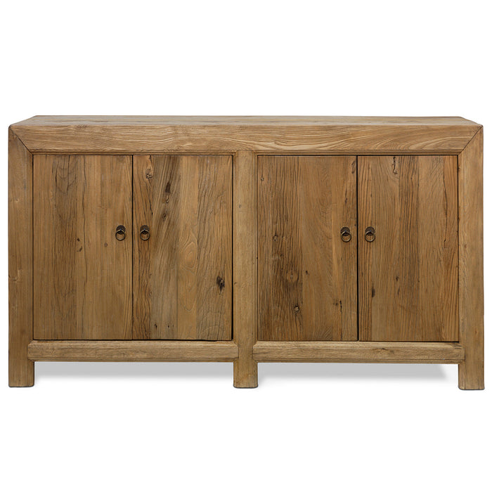 The simple design and construction of this chunky, solid wood sideboard makes it suitable for various settings, offering ample storage within each of its two compartments. The doors fit neatly into the cabinet frames above and below with wooden dowels, maximizing space for the beautiful, textured reclaimed elm wood doors. The minimalist aesthetic is enhanced by sleek brass ring handles.