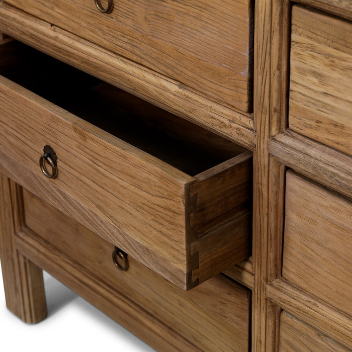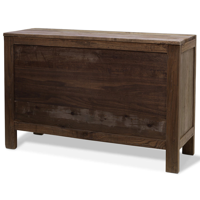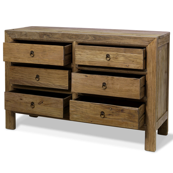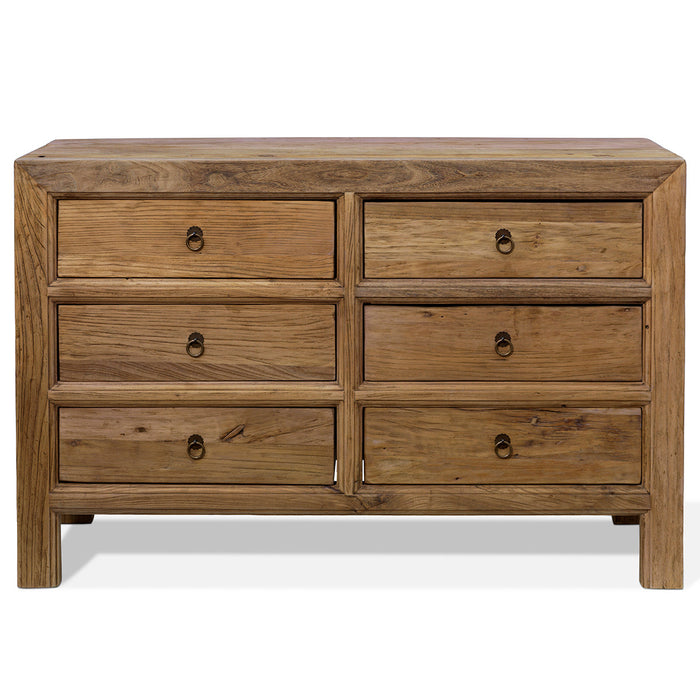 Featuring thick, robust frames and beautifully figured, reclaimed elm wood, this generous chest of drawers is a versatile addition to any bedroom, kitchen, or dining room. Featuring six spacious drawers, each with a sleek brass ring handle, the chest offers ample storage no matter how you use it.