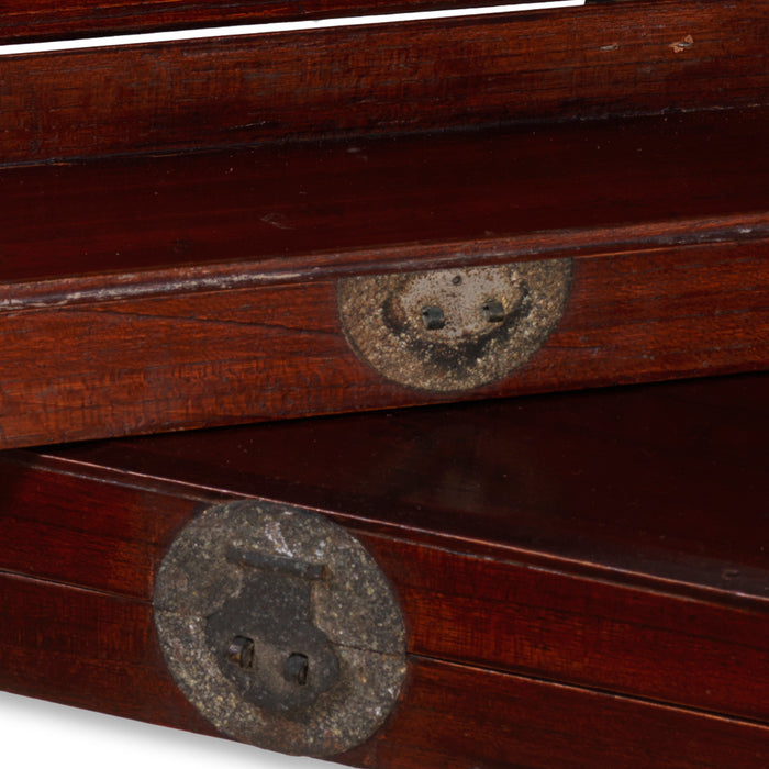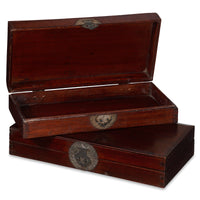 Ces petites boîtes peu profondes étaient peut-être autrefois utilisées pour stocker du matériel d'écriture tel que des pinceaux de calligraphie, des bâtons d'encre et des côtelettes - des objets utilisés par les classes savantes en Chine. Ils sont fabriqués à partir de bois de hêtre teinté de bois foncé, la quincaillerie d'origine étant toujours en place. Vendu à l'unité, le prix indiqué est pour chaque boîte.