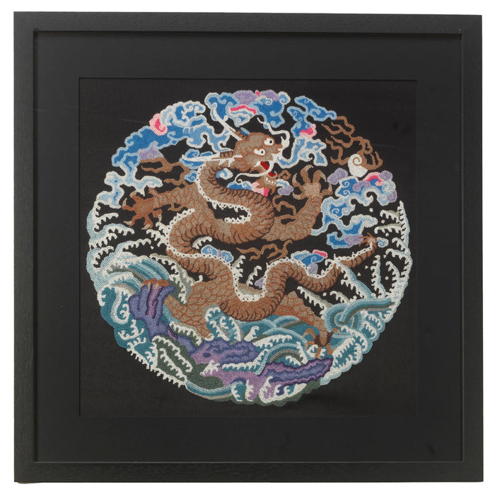 Ces belles pièces sont des reproductions de motifs en soie brodés qui étaient utilisés pour décorer les robes des fonctionnaires chinois et de leurs épouses. Chacun est cousu à la main en soie et vendu encadré comme indiqué. Cette soie particulière représente un dragon céleste, gardien des cieux et symbole du pouvoir et de la domination impériale. Veuillez noter que chaque pièce est cousue à la main et que les motifs peuvent donc varier légèrement par rapport à l'exemple présenté.