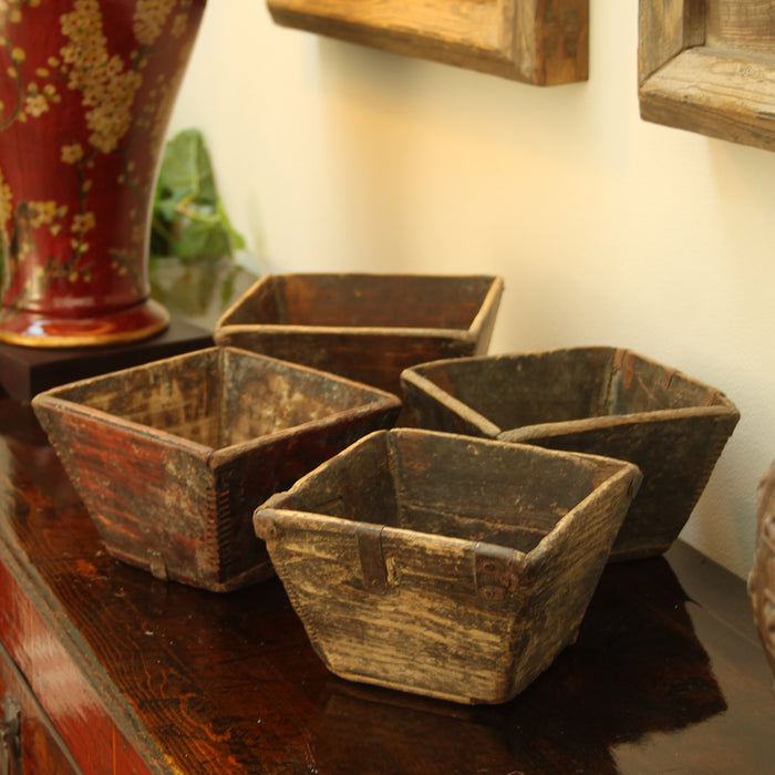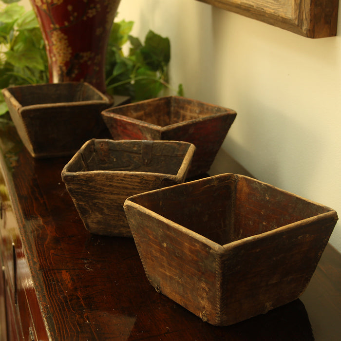 Ces petits récipients en bois étaient autrefois utilisés comme mesures à riz en Chine. Aujourd'hui, ils fabriquent de petits bols utiles sur une console pour les clés et la monnaie, peuvent servir de porte-plantes ou réaliser des objets de décoration insolites. Chacun varie légèrement en termes de taille, de couleur et de style.