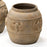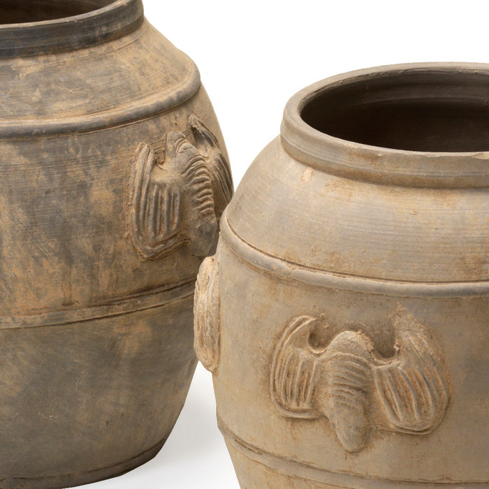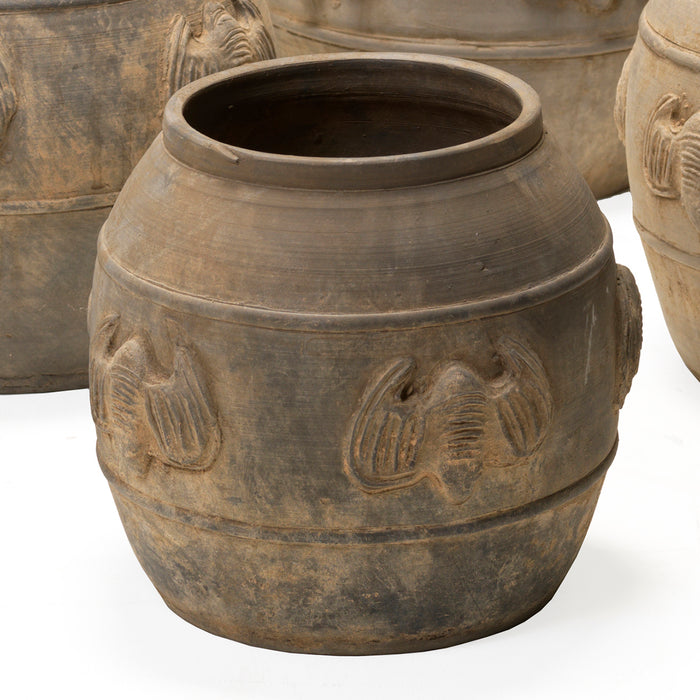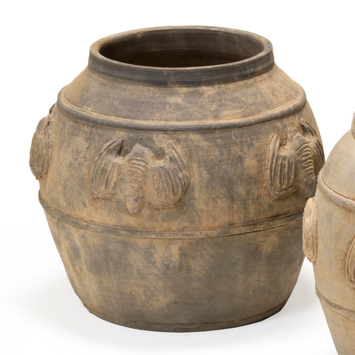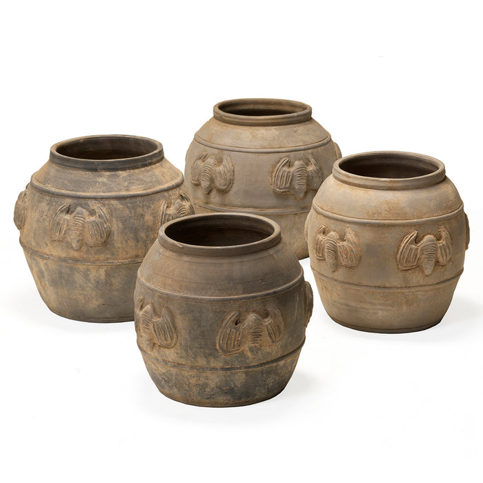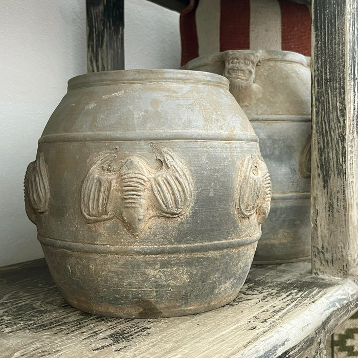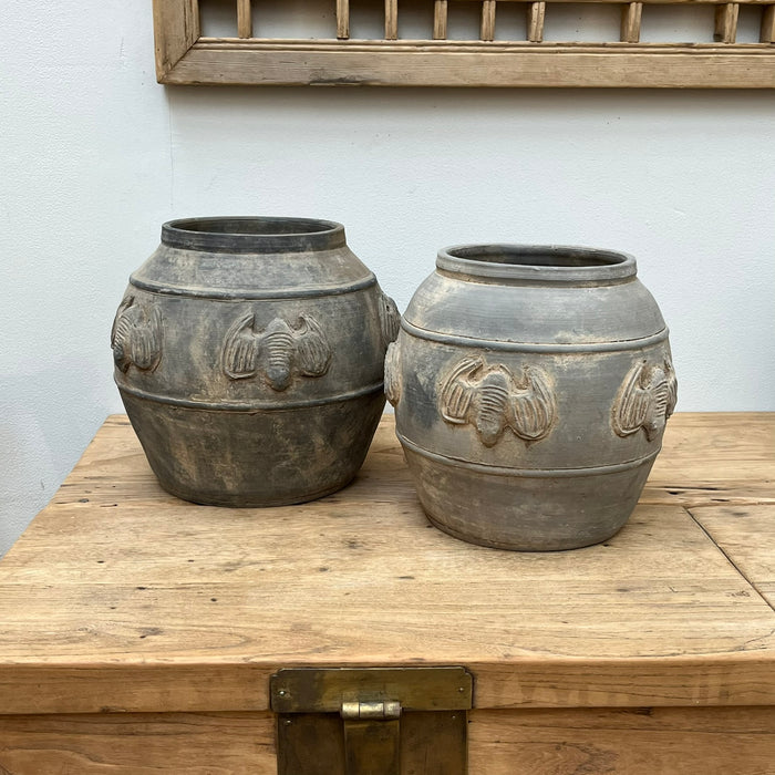 These lovely stoneware pots are great as indoor plant holders. They were produced around the mid 20th century, originally used to store oil or wine. Each one incorporates four upside bats around the centre as a symbol for good luck. In Chinese words for "upside down" and "arrive" are homonyms, as are the words for "bat" and "fortune" so the inverted image of a bat is meant to convey the idea that happiness is arriving from heaven.