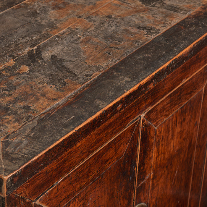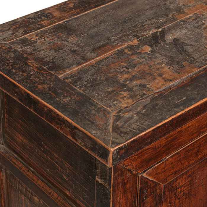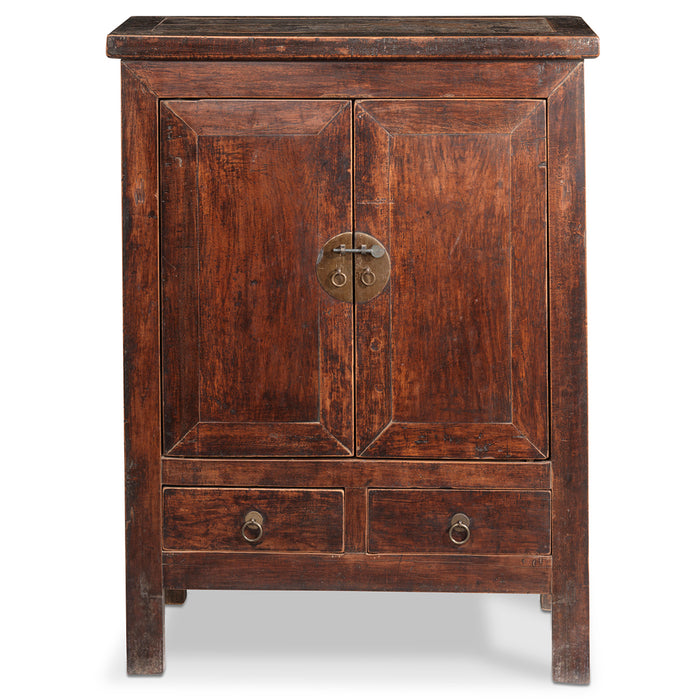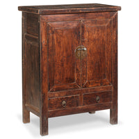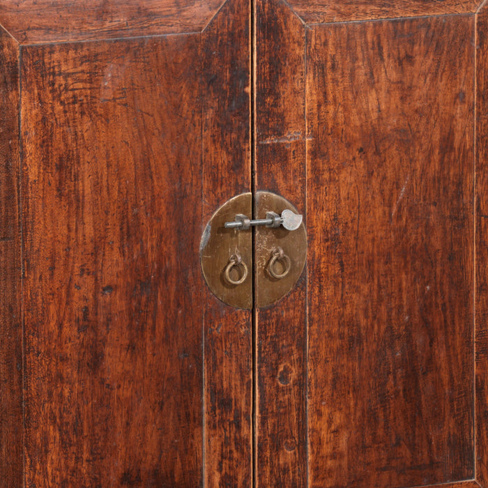 Fabriquée dans la province du Gansu, l'armoire est savamment construite avec des cadres robustes, des panneaux épais et un gros plateau en surplomb. Son aspect vieilli, en particulier la surface supérieure usée, ajoute à son charme, tandis que la simple quincaillerie circulaire des deux portes a probablement remplacé l'originale. De plus, deux tiroirs inférieurs et une seule tablette amovible offrent un grand espace de rangement.