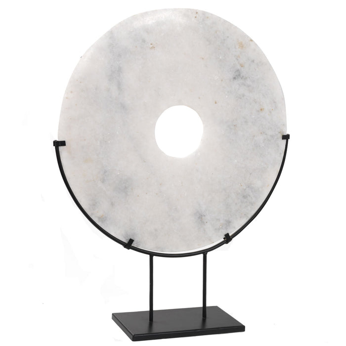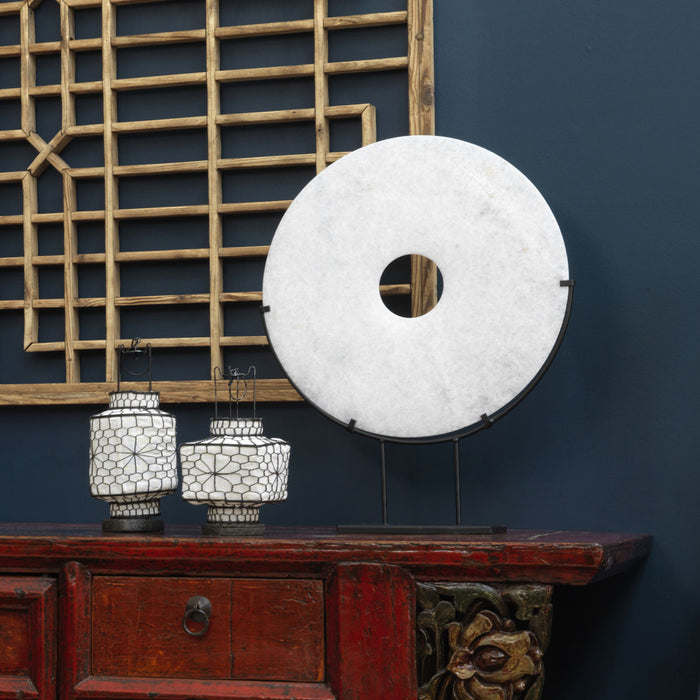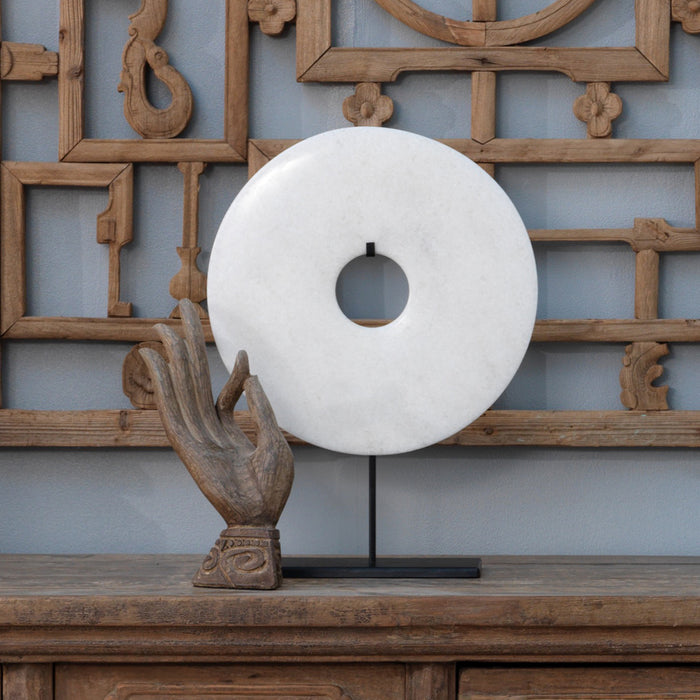 Nos magnifiques disques de pierre, connus sous le nom de « bi » (prononcé « abeille ») en chinois, sont fabriqués à partir de jade ou d'une autre pierre. L'anneau extérieur et le trou central symbolisent le ciel et la terre et sont censés apporter bonheur et paix dans la maison. Celui-ci est dans une belle pierre blanche et est livré avec sa monture métallique comme présenté. Ils sont disponibles en trois tailles. Veuillez noter que chaque pièce est individuelle et peut donc varier légèrement par rapport à celle illustrée. Des photos des articles en stock actuel peuvent être fournies sur demande.