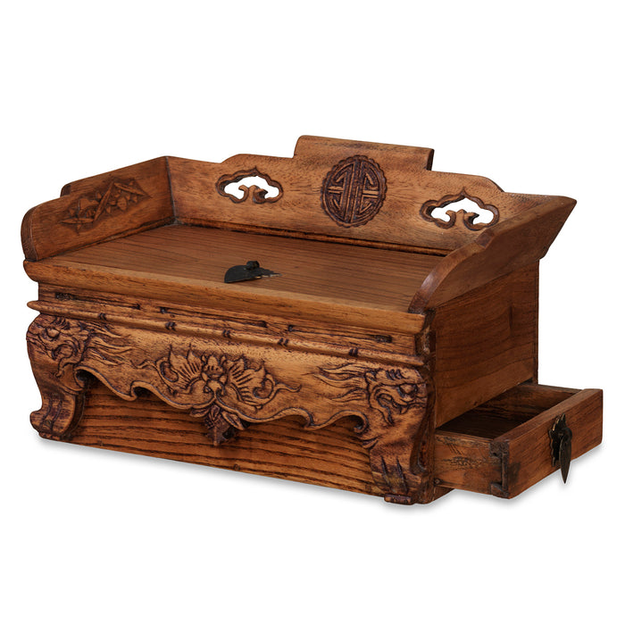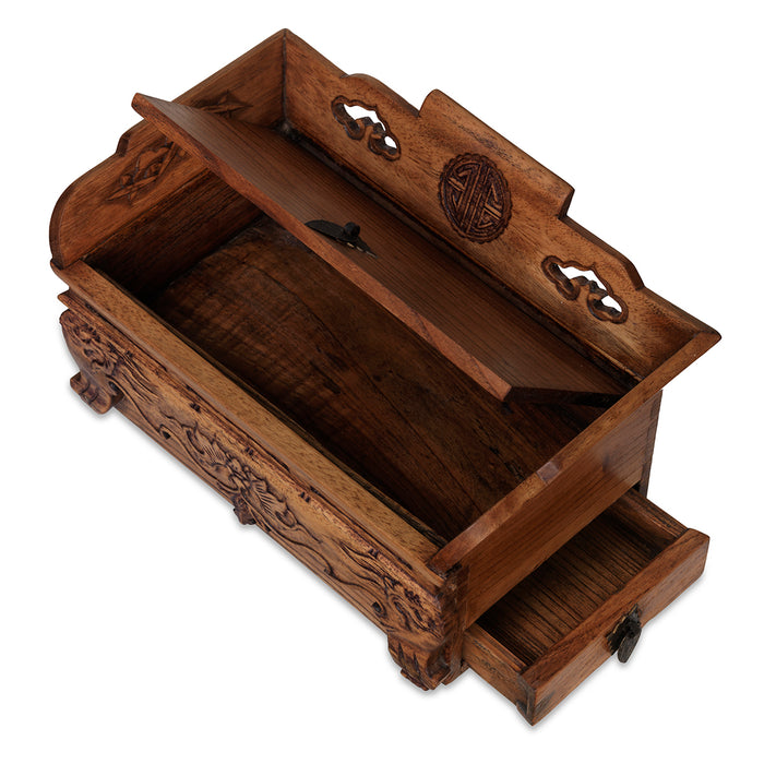 Cette boîte en bois traditionnelle est originaire de la province du Zhejiang, dans le sud-est de la Chine. Fabriquée en bois de hêtre avec un couvercle supérieur et un tiroir peu profond, sa face avant présente une magnifique sculpture florale. Utilisé à l'origine par les femmes de la classe moyenne du Zhejiang pour leur maquillage, il constitue aujourd'hui une excellente boîte de rangement, parfaite pour conserver des bijoux ou des bibelots plus petits.
