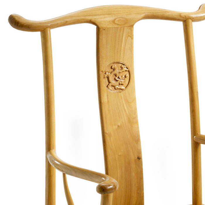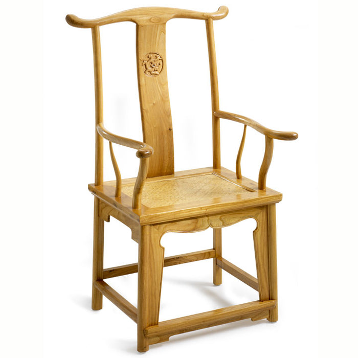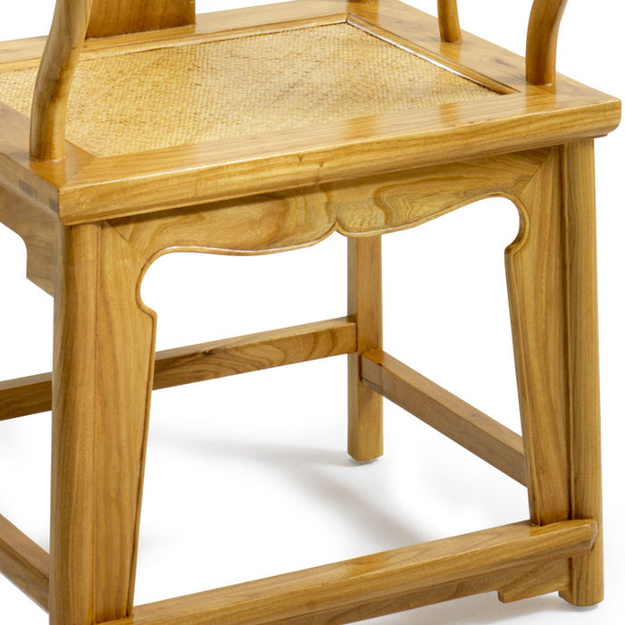 Idéal individuellement dans une chambre ou un salon comme pièce maîtresse, ou utilisez-les à la tête de nos tables à manger. Ce modèle en orme clair est fabriqué à partir de bois d'orme massif récupéré avec un siège en rotin. Ce style de chaise a été l'un des premiers à apparaître en Chine, avec des traces picturales remontant au VIe siècle. Le nom « Yoke-back » fait référence à la forme de l'appui-tête incurvé, mais le style est également connu sous le nom de chaise « Chapeau officiel », car on pensait également que l'appui-tête ressemblait aux chapeaux ailés des mandarins chinois de la dynastie Ming. Notre version présente les mêmes belles courbes et les mêmes détails que notre chaise d'appoint à dossier joug, y compris le dragon en relief sculpté sur le dossier incurvé. Cependant, il est légèrement plus grand et possède des accoudoirs magnifiquement incurvés et saillants qui caractérisent ce style.