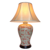 Cette lampe vase orientale classique a un design rose rougeâtre représentant un poisson rouge à queue en éventail nageant parmi des bulles et des plantes sur un fond de biscuit crémeux. Monté sur un support en bois dur et fourni avec un abat-jour doré en fausse soie, comme indiqué.