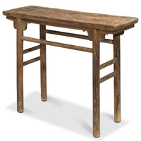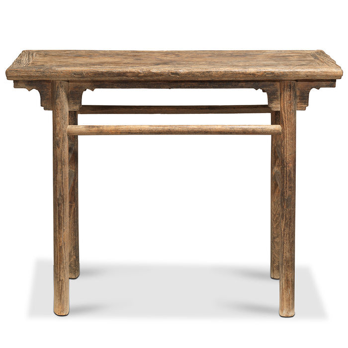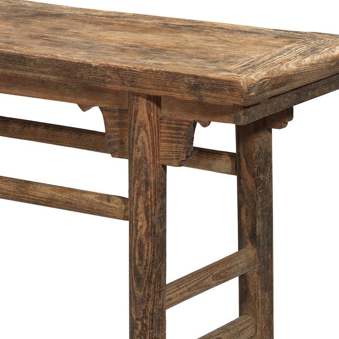 This distinctive table is of a type that was used in China for centuries for serving food and drink, but also as a more general display surface. The thick table top extends over rounded, recessed legs that are supported with long single stretchers to the front and back and double stretchers at the sides. Below the table surface and at the top of the legs is a simple, moulded apron and spandrels, which still show large traces of the original dark lacquer finish. On the table top and legs the finish has mostly worn away, showing the natural colour and attractive, wide grain of the elm wood. The table is a perfect example of the ingenuity of tradition Chinese carpentry, with the legs, stretchers, apron and table top all fitted together with mortise and tenons that do away with the need for nails. Great as a display console today to bring warmth and character to any space.