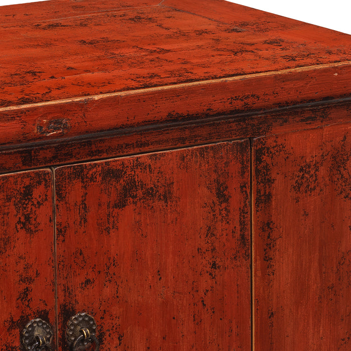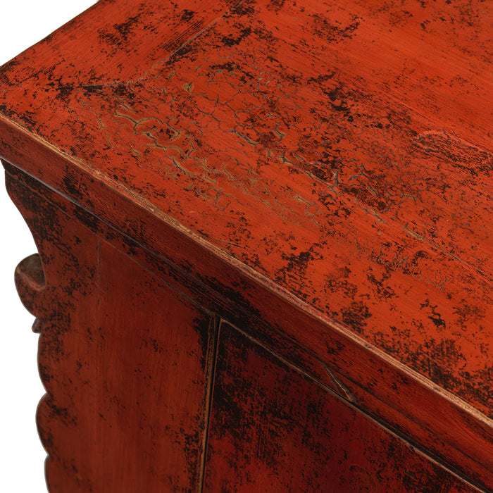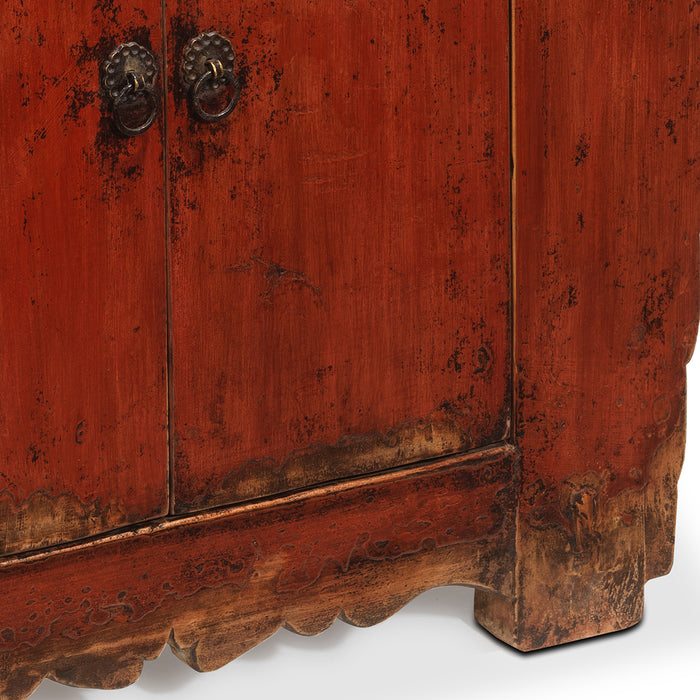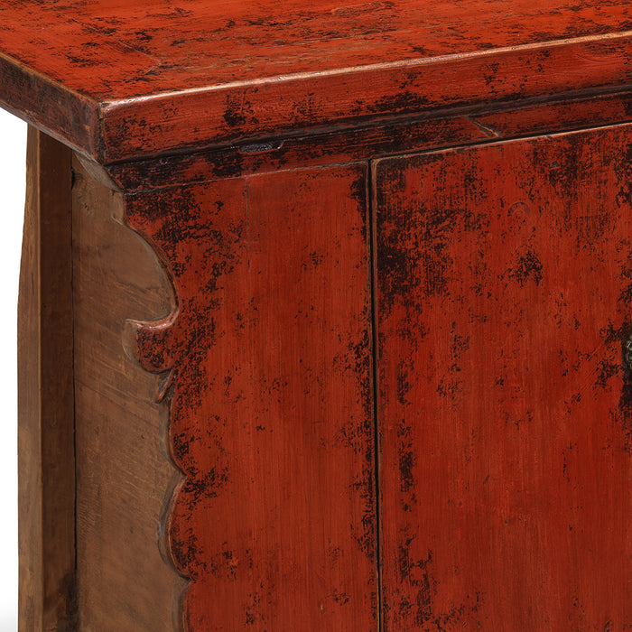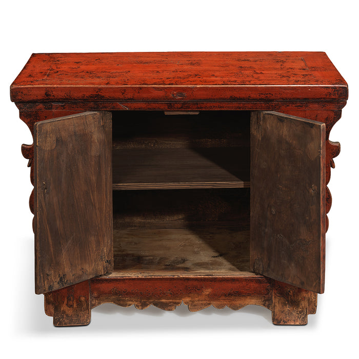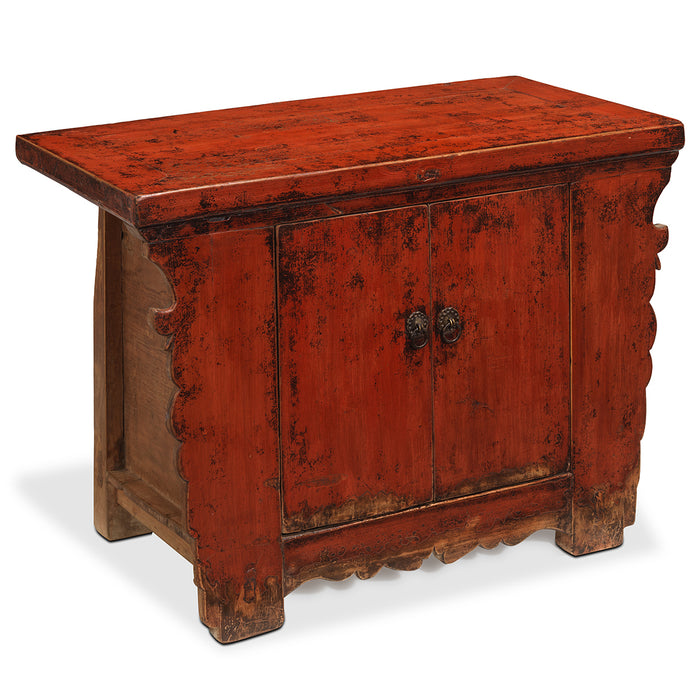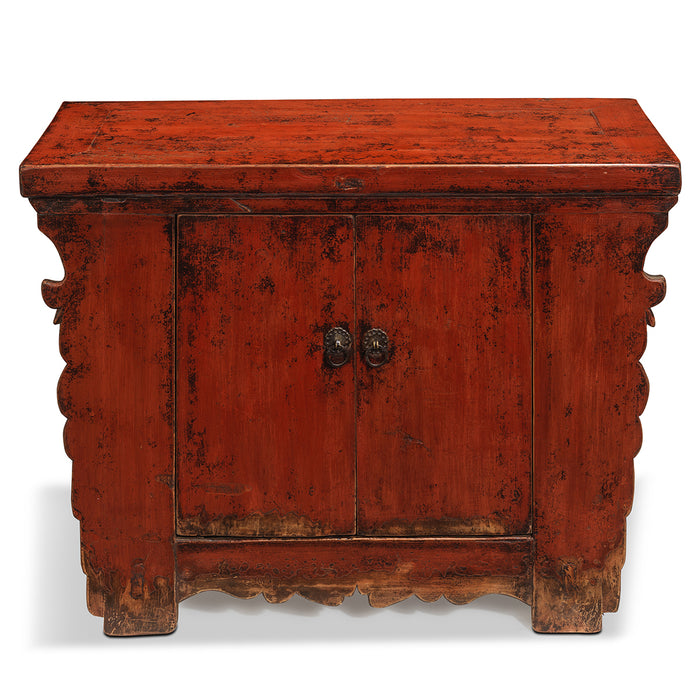 With centrally fitted doors and carved sides that taper down to the feet to give an elegant silhouette, this old red lacquer cabinet would work well as a beside unit or perhaps as a stand for a small television. It is made from pine, produced in the northwest province of Qinghai. The lovely, deep red lacquer is original, now worn in parts particularly around the feet and the bottom, carved apron. Produced from a cinnabar pigment that was available exclusively in Qinghai and a few other regions of China, it has softened over time but would still add a lovely pop of colour to any setting. The cabinet has been fitted with ring handles on the doors and a single removable shelf inside.