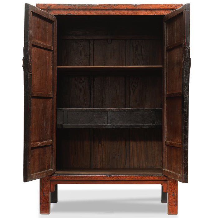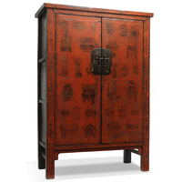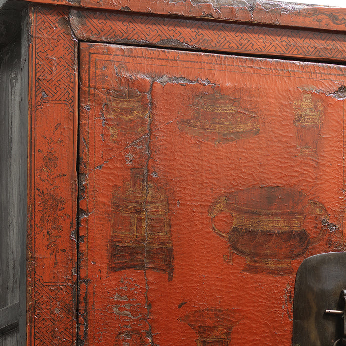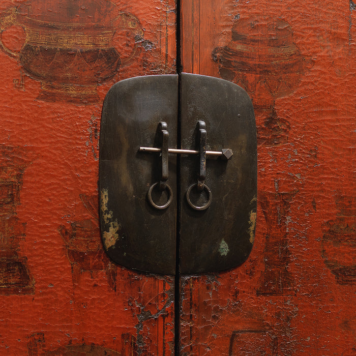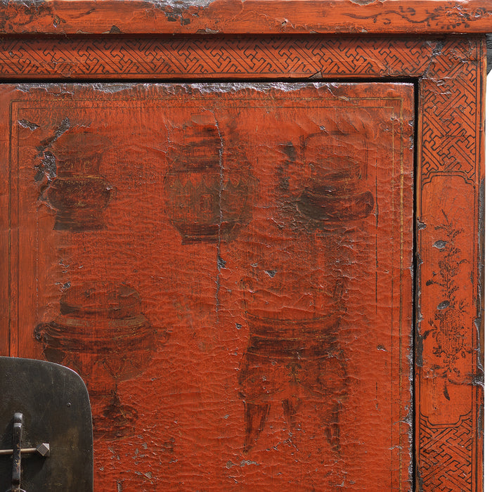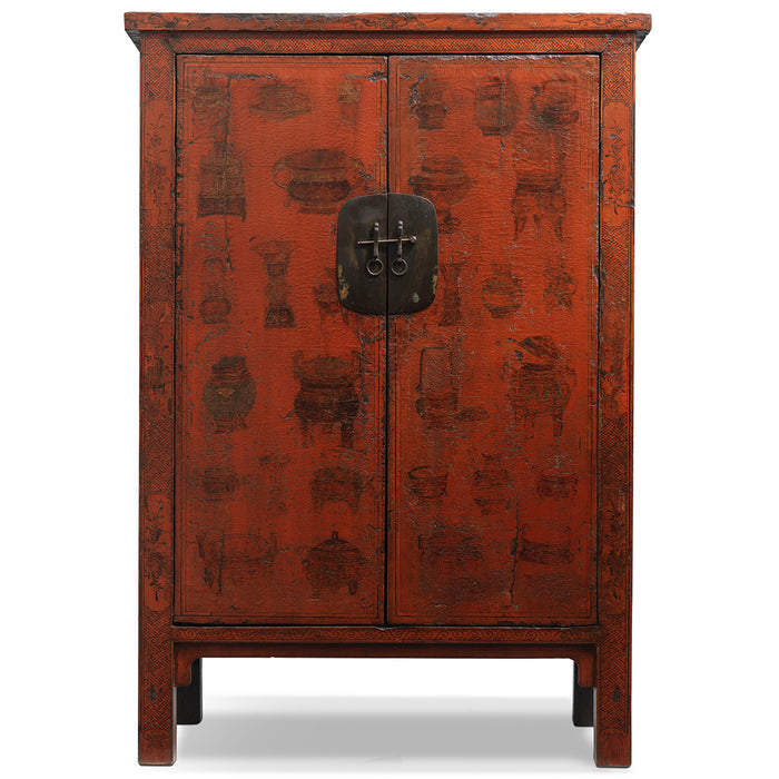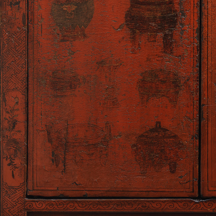 This fine antique cabinet dates from around 1880 and was made in northern China. It is finished in a rich, deep red lacquer that has aged beautifully over time, with the soft sheen and natural wear characteristic of authentic antique Chinese furniture. The front is decorated with a series of painted vessels and ritual bronzes, arranged in careful symmetry across the doors.