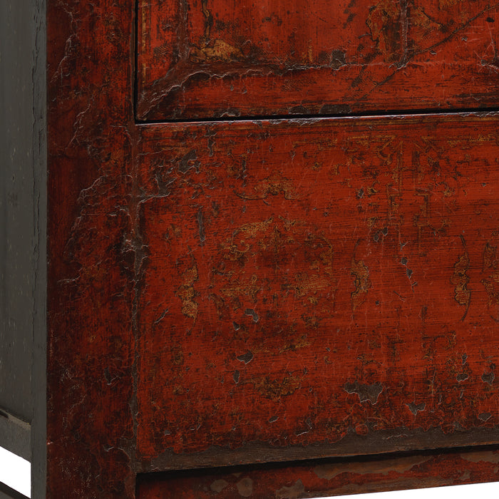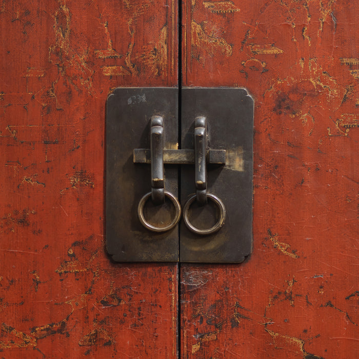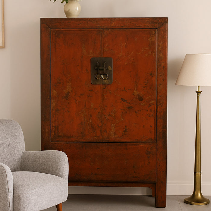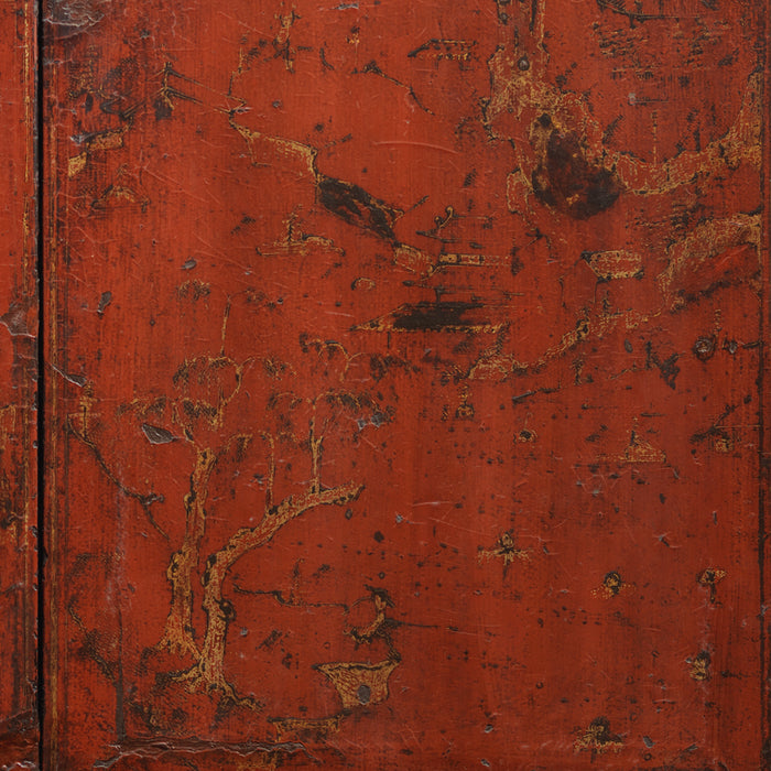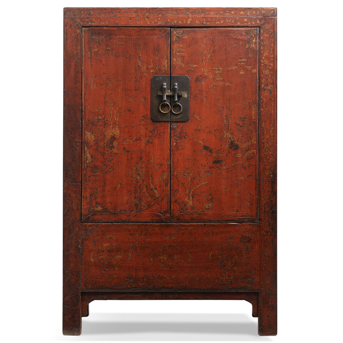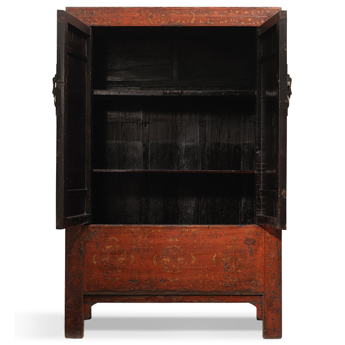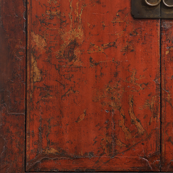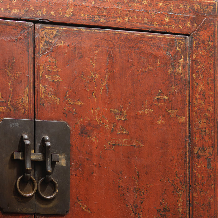 Dating from the late nineteenth century, this elegant cabinet originates from Shanxi province in northern China and is finished in a rich, warm red lacquer that has aged beautifully over time. The surface of the doors is subtly decorated with traces of traditional landscape scenes, including pagodas, trees and mountains, now softly worn with age to reveal a wonderful depth of colour and texture. The outer frames and bottom apron are adorned with floral patterns along with bats and butterflies - symbols for good luck and long life. The faded gilt decoration, known as 'miao jin', adds character and charm, giving the piece a quiet, understated beauty that speaks of its long history.