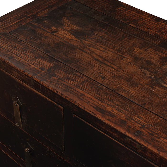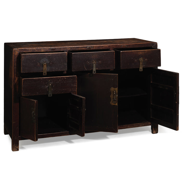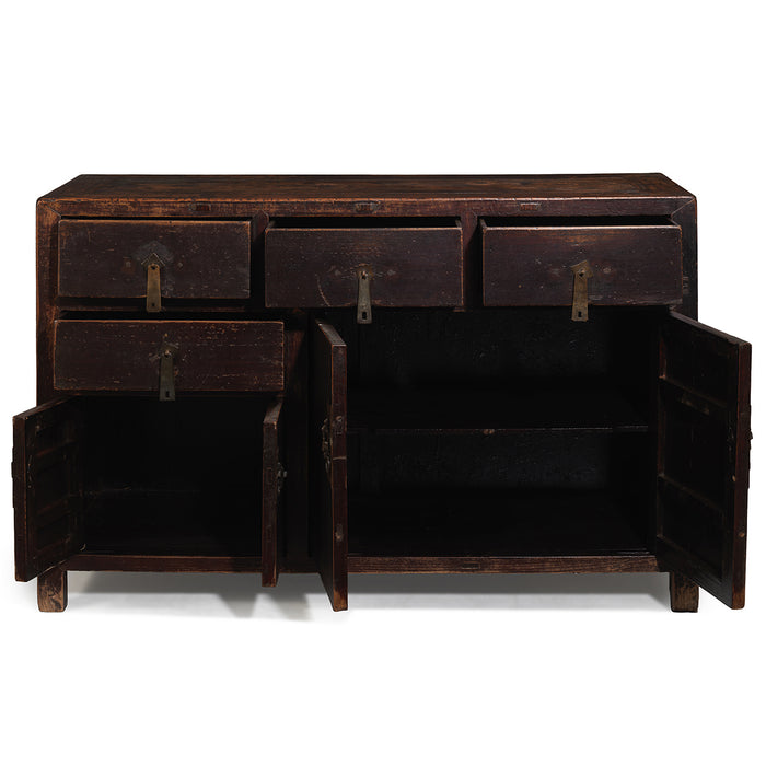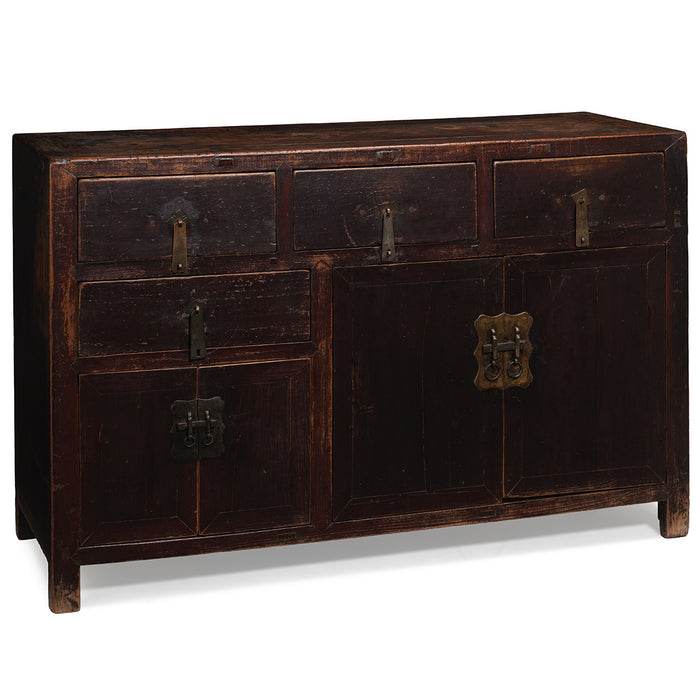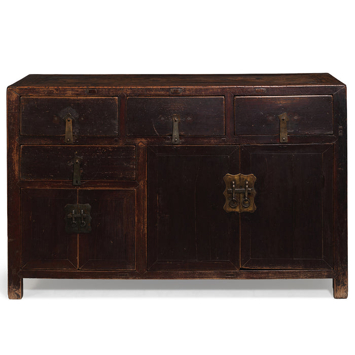 This characterful sideboard originates from Shanxi province and dates to the early nineteenth century. Shanxi furniture from the period is admired for its strong, architectural forms and durability and this piece is a fine example. Constructed in solid elm, the sideboard retains its original dark lacquer, now beautifully worn and softened by nearly two centuries of use. The lacquer has mellowed to a deep, earthy tone, with areas of gentle distressing along the drawers, doors and frame that reveal the natural grain beneath and testify to the cabinet’s long life. The top surface in particular has a beautiful patina, showing the rich, wide grain of the elm wood.