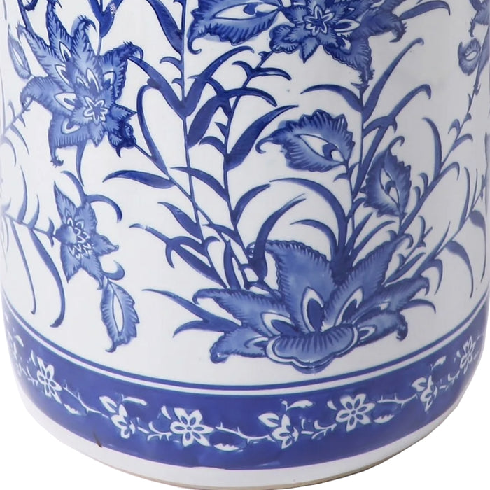 This striking porcelain umbrella stand features a traditional floral pattern in blue against a white background. A darker blue band to the top and bottom frames the main design perfectly. Ideal either to hold umbrellas or used as a large vase for flowers.