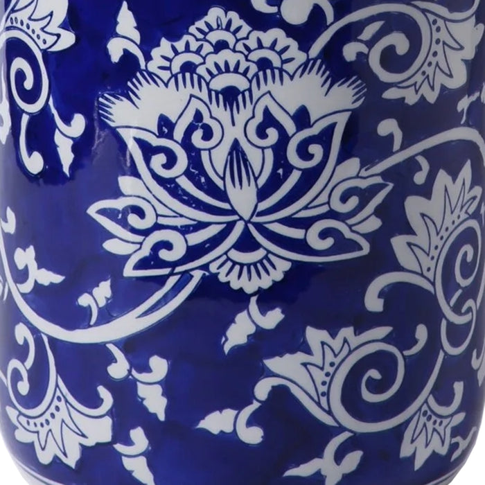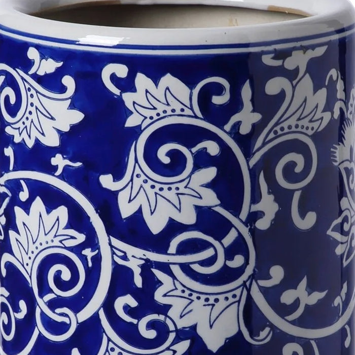 This beautiful umbrella stand is in a deep, classic cobalt blue with a contrasting scrolling floral pattern in white. Perfect to hold umbrellas in a hallway or as a large vase for a flower arrangement. Made from porcelain with a classic Chinese glaze in blue and white.