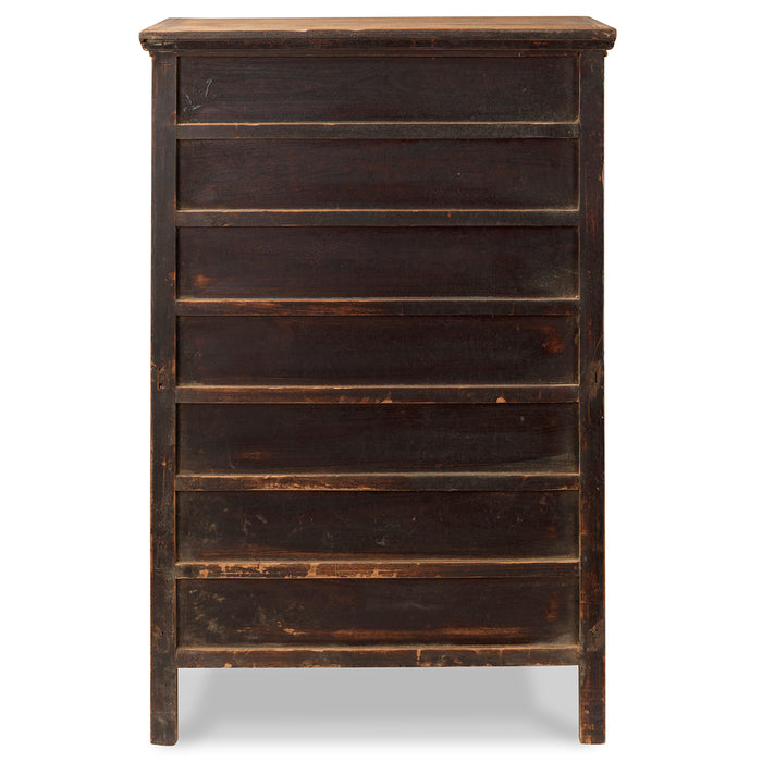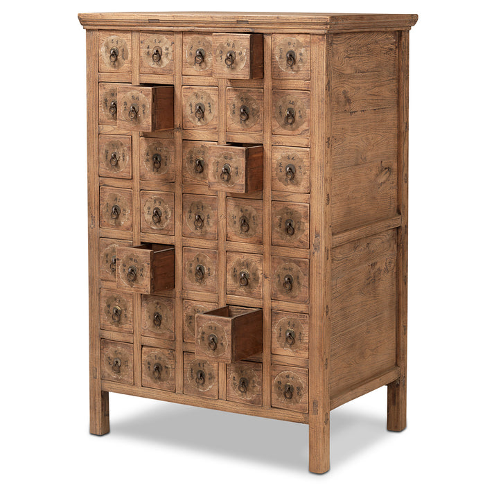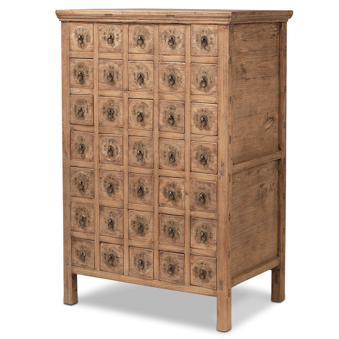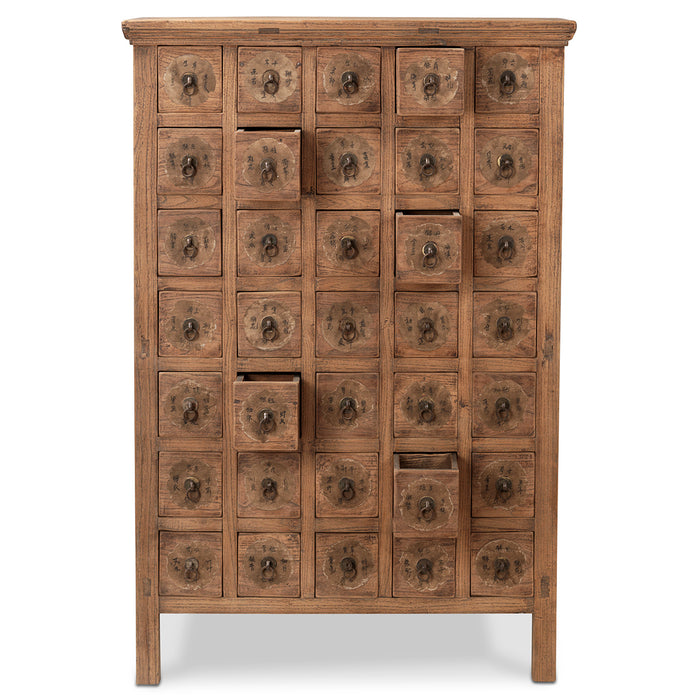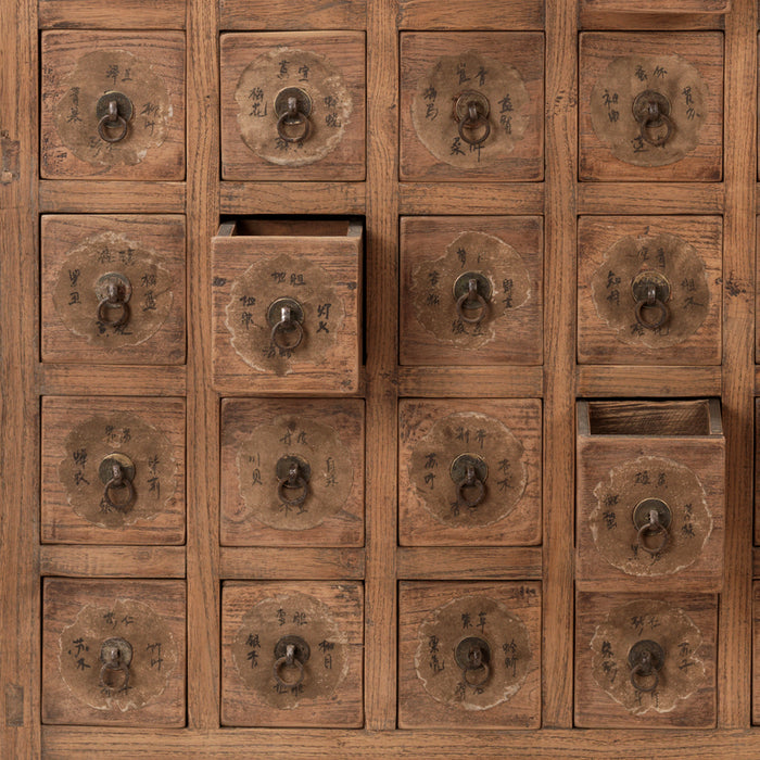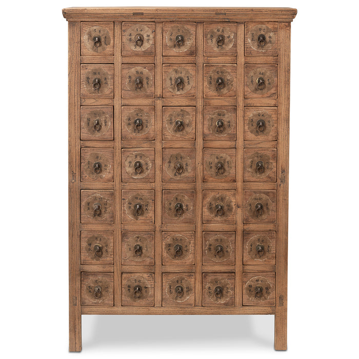 Ce magnifique coffre d'apothicaire est dans un bel état et présente un savoir-faire et un design raffinés. À l’origine, il aurait été utilisé soit dans une maison aisée, soit par un apothicaire chinois traditionnel pour contenir une variété d’herbes médicinales, de racines et de remèdes. La commode comporte trente-cinq petits tiroirs, chacun doté d'une poignée en anneau et divisé en quatre sections par des séparateurs internes, offrant un rangement individuel pour des objets spécifiques. Unique à chaque tiroir se trouve une étiquette circulaire affichant des caractères chinois écrits à la main pour indiquer son contenu, lus dans le sens des aiguilles d'une montre à partir du haut. La finition en bois d'orme est originale, avec un ton doux qui se marie joliment avec les étiquettes usées et décolorées pour un effet feutré qui s'intégrera facilement dans n'importe quel intérieur. Magnifiquement conservés, les coffres d'apothicaire comme celui-ci sont de plus en plus rares à trouver et constitueraient un ajout charmant et unique à n'importe quel espace.
