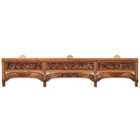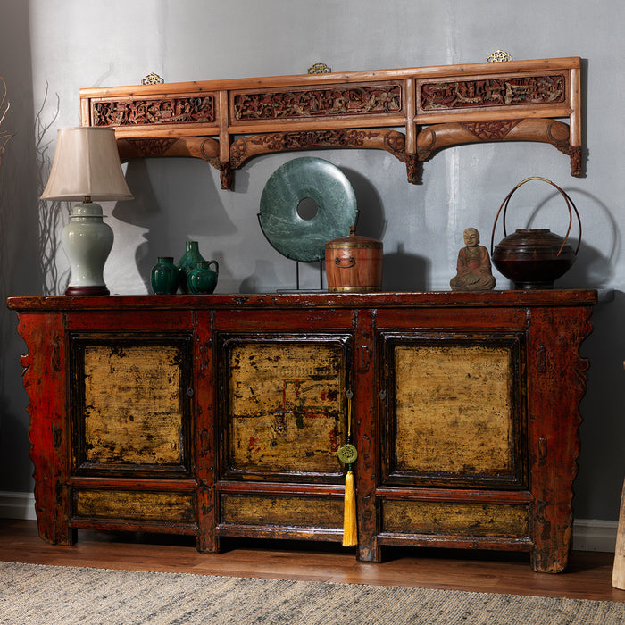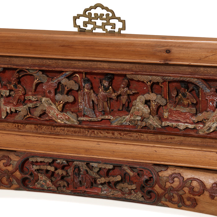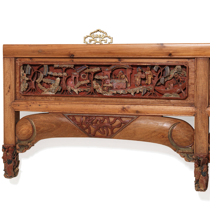 Ce long panneau de hêtre inhabituel a été récupéré de la façade d'un lit matrimonial à baldaquin de la fin du XIXe siècle, sur lequel il aurait formé la façade principale au-dessus de l'entrée. le lit a été fabriqué à Shanghai, dans l'est de la Chine et le panneau conserve encore une partie de sa peinture d'origine en or, noir, rouge, bleu et blanc. Il est composé de trois panneaux supérieurs finement sculptés, chacun soutenu par un arc avec une autre sculpture incrustée.