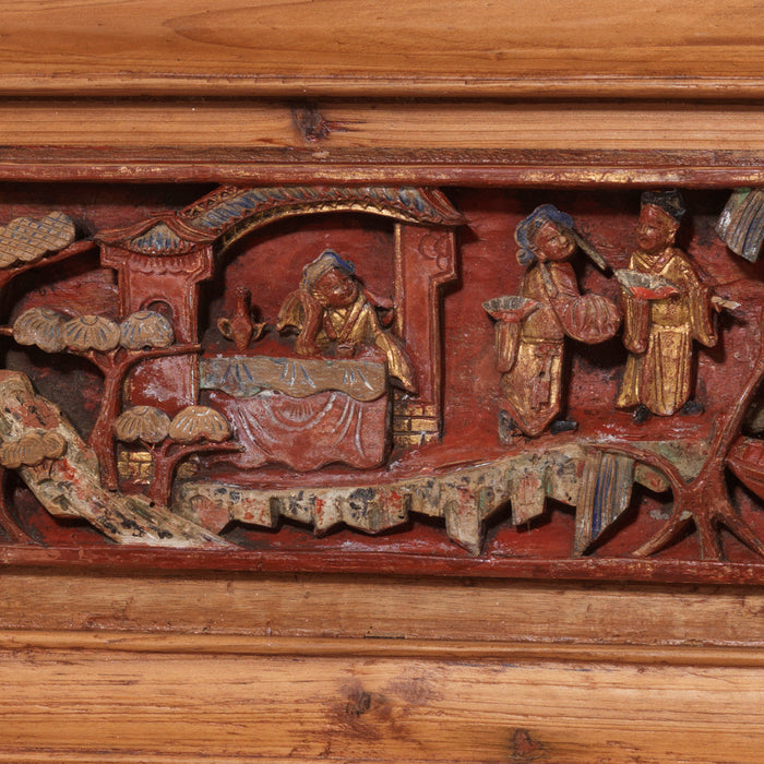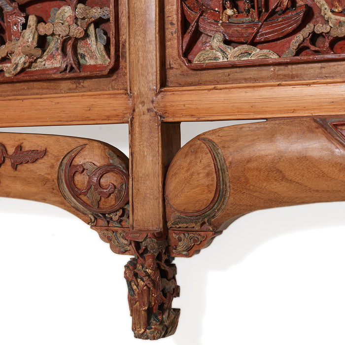 Les sculptures elles-mêmes sont en profond relief, donnant une impression tridimensionnelle. Ils sont merveilleusement conçus et détaillés, montrant une scène d'une histoire traditionnelle chinoise : divers personnages vêtus de riches robes dorées ainsi que des bateaux arrivant à terre et des tours de pagode. Les tabliers arqués situés sous chaque panneau principal sont sculptés et peints de la même manière et même les quatre pieds à la base sont sculptés en forme d'arbres et de personnages richement habillés. Parfait aujourd’hui encore comme tête de lit au-dessus d’un lit ou tout simplement comme décoration murale unique.