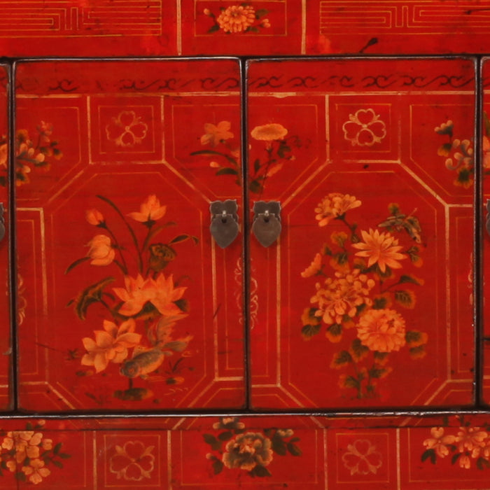 The doors are adorned with elegant paintings of various flora and fauna including lilies, butterflies and fish. The outer frames feature flowers above and below the doors and geometric scrolling patterns picked out in gold. The bold and colourful combination of greens, blues, and golds in the paintings is now faded to softer tones but still contrasts beautifully against the red lacquer background. The sideboard has been updated with four additional doors and a full width shelf, making it a stunning and functional storage piece for any space.