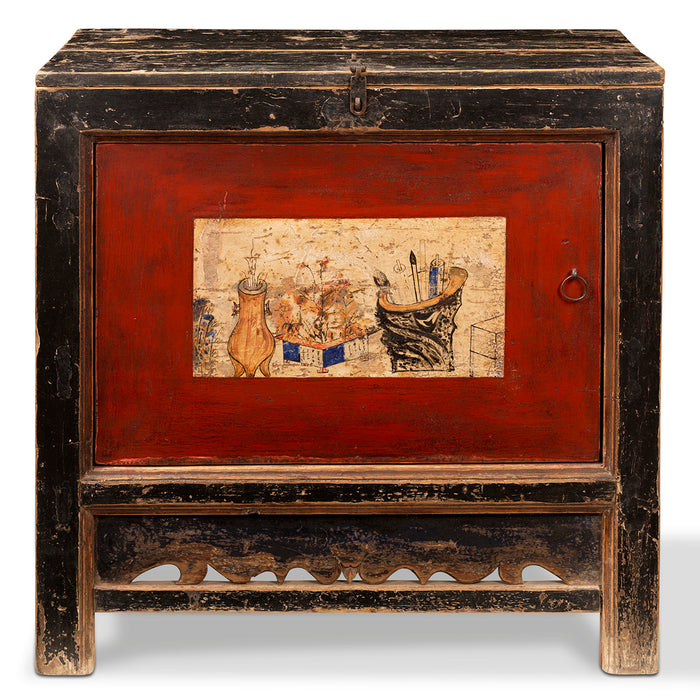 Le meuble présente des couleurs traditionnelles pour ce type de pièce, avec de la laque noire utilisée pour les gros cadres extérieurs et un contraste rouge et crème pour la façade. Les peintures sur le devant de la porte montrent un vase de fleurs et un pot à pinceaux de calligraphie parmi d'autres effets personnels, servant de thème commun conçu pour refléter le statut d'érudit du propriétaire. Autrefois beaucoup plus vives, les couleurs se sont estompées au fil du temps pour devenir des tons plus subtils, conférant un aspect vieilli et désuet au meuble.
