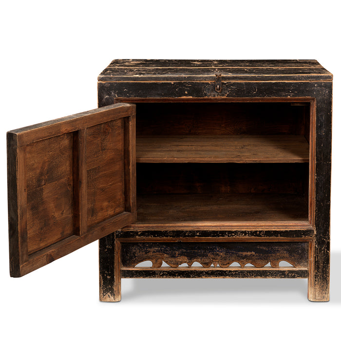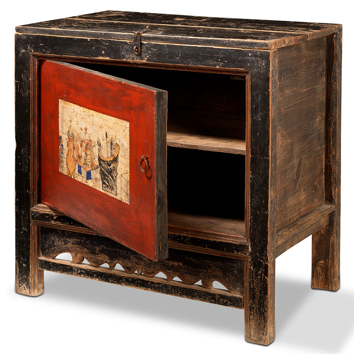 Cette élégante armoire latérale est fabriquée à partir de bois de peuplier et présente un design traditionnel que l'on retrouve souvent dans les unités de rangement fabriquées dans la partie orientale de la province du Gansu ou en Mongolie intérieure. Utilisée à l'origine pour stocker le grain, l'armoire a été transformée en une armoire de rangement moderne plus pratique en réduisant une unité plus grande et en ajoutant une porte à l'avant, adaptant le panneau fixe d'origine. Lors de sa fabrication initiale, l'accès à l'intérieur de l'unité n'était possible qu'en retirant un couvercle en demi-panneau situé sur le dessus. Dans ce cas, la planche a été conservée dans sa forme originale, ajoutant une caractéristique unique à la pièce.
