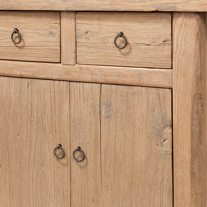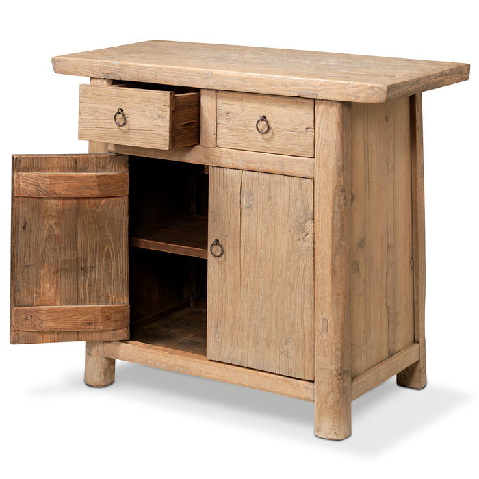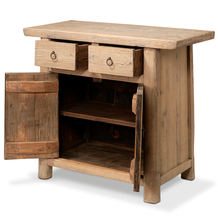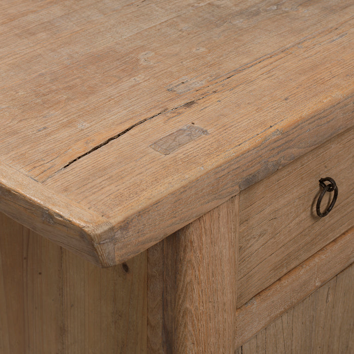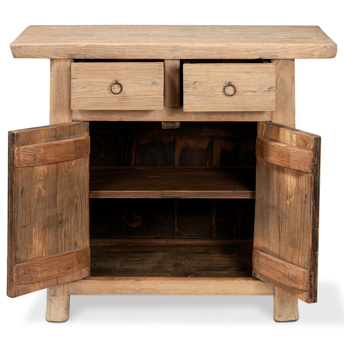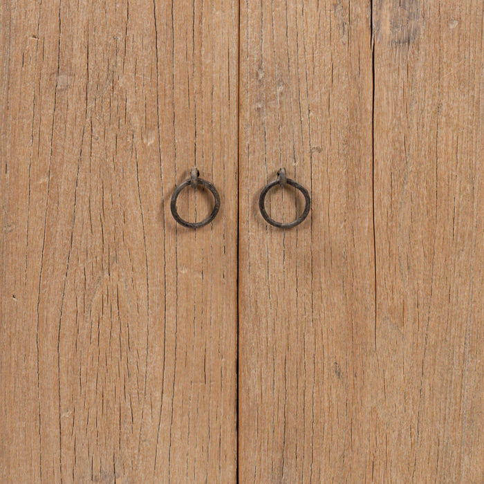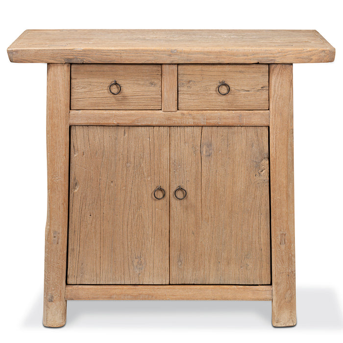 Cette jolie armoire au fini naturel est nouvellement fabriquée à partir de poutres d'orme récupérées dans un style traditionnel. Les cadres épais s'effilent à partir des pieds, s'insérant directement dans la surface supérieure épaisse et en surplomb. Les portes sont montées directement dans les cadres au-dessus et au-dessous sur des chevilles en bois, donnant un aspect pur et simple qui s'intégrera facilement dans n'importe quel espace. Deux tiroirs, équipés de simples poignées en anneau de fer assorties aux portes, offrent un espace de rangement supplémentaire et il y a une seule étagère amovible à l'intérieur. Le bois d'orme naturel pâle a un caractère tactile distinctif, avec un joli grain et un aspect vieilli et patiné.