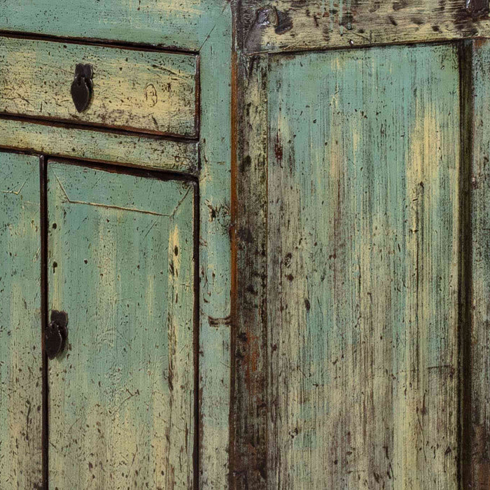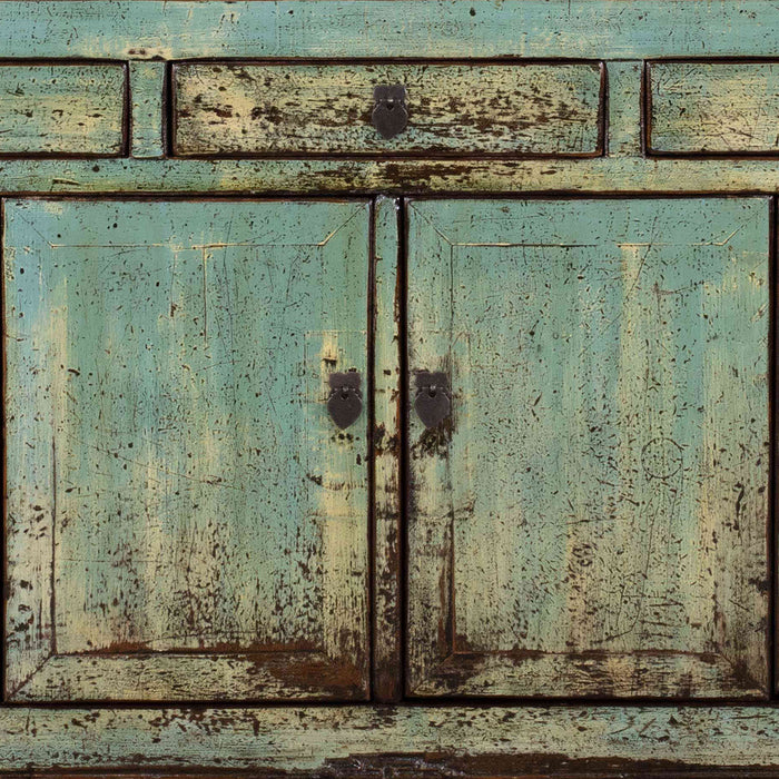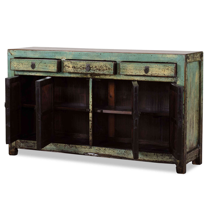 This lovely sideboard, in a soft, pastel blue green finish, was originally produced in the northeast (Dongbei) region of China around the middle of last century. It would once have been finished in red, with decorative paintings in gold, but has been refinished in a fresh, distressed lacquer that would fit easily into many more contemporary settings. Originally, only the central doors were functional, while the outer sections remained fixed. These outer panels have now been modified to open, allowing for more practical use today. Additionally, the central post between the doors can be removed for easier access to the interior, which features a single shelf.