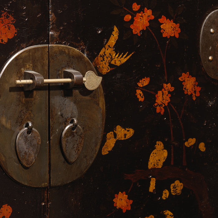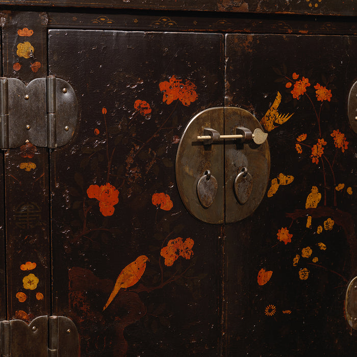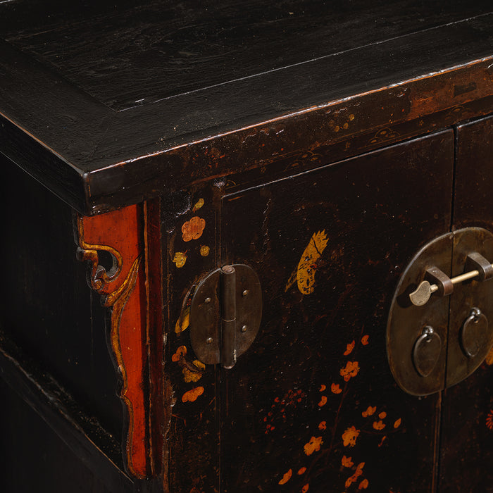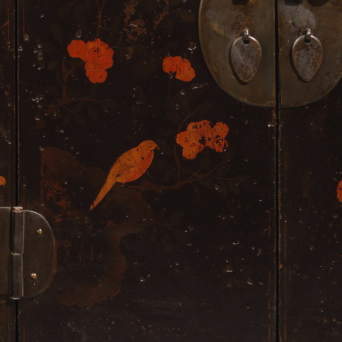 The front is beautifully decorated with painted floral and foliate motifs in shades of red, ochre and gold, arranged in delicate sprays across the doors and lower apron. These auspicious floral designs symbolise prosperity, beauty and renewal in traditional Chinese culture. Two songbirds perched on branches represent happiness, while the crane shown to the bottom of the left hand door signifies longevity. The cabinet’s outer uprights are further embellished with hand-carved and painted spandrels, which largely retain their original red and gold colours.
