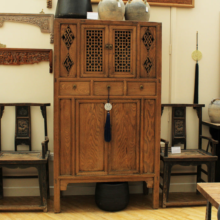 This lovely tassel features a circular jade centrepiece carved through with a 'double happiness' symbol - a motif often used for marriage. Measuring approximately 50cm, it's an eye-catching addition to any cabinet. It can also be displayed on a door handle or as a decorative element on a wall. The deep blue hue complements well with our cream lacquer or elm furniture.