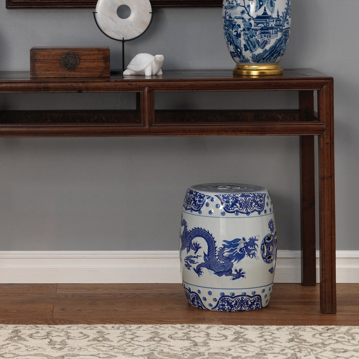These white glazed ceramic stools are reproductions of pieces that were used for indoor and outdoor seating particularly in southern China for centuries. They are not frost resistant, but can be used outdoors during the summer months and make lovely little side tables. The main glazed decoration shows a pair of dragons, while the top is in a floral pattern, with bats and 'fu' characters to symbolise good fortune.
