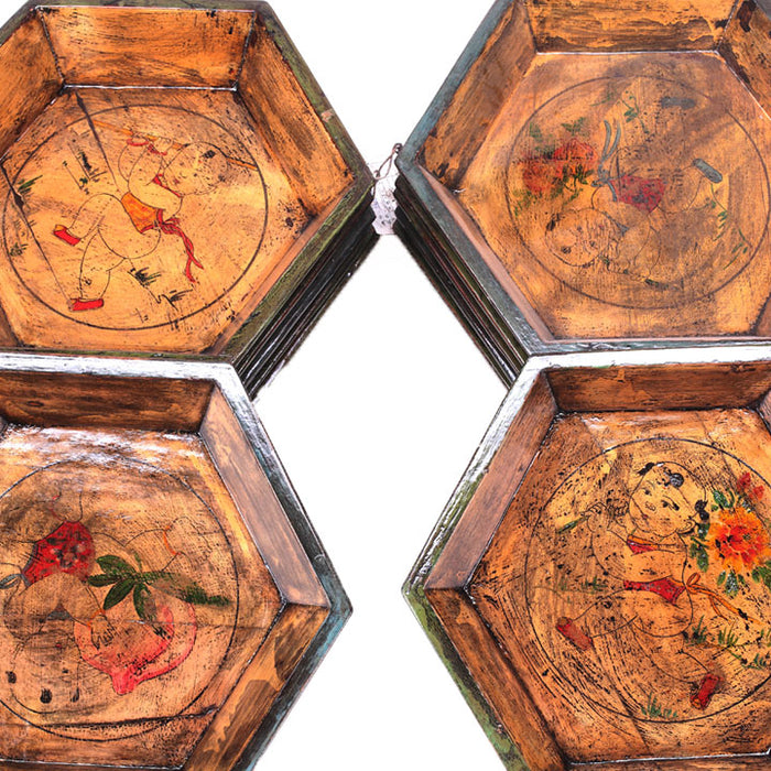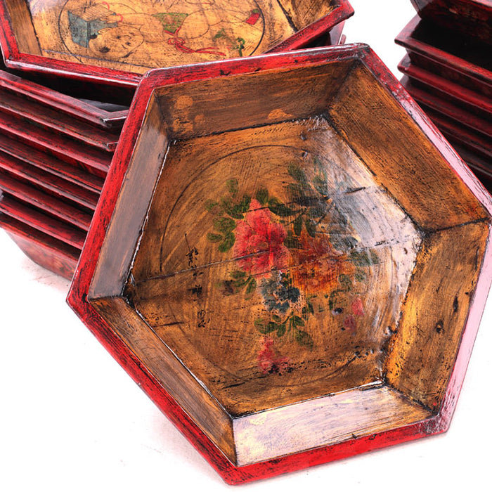 These lovely old hexagonal shaped wooden trays all differ slightly in terms of the colours and the decorative paintings on the inside. They are made from pine and are old but have been restored and repainted with traditional designs, including children and flowers. Perfect as fruit bowls or just as interesting ornaments.