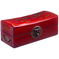 Pillow boxes like these were commonly used in China during the Qing dynasty to deter would-be thieves. The owner would place valuables inside the box and rest his head on the concave lid. Many of these boxes were made of plain wood with no decoration, but more wealthy merchants would use boxes covered in leather and decorated with fine designs. Our boxes are covered with leatheroid, hand-painted in gold with classic designs such as the dragon and phoenix, and with a brass clasp and hinges. The insides are lined with old Chinese calendar paper or old newspaper. Please note that sizes and designs will vary from those shown.