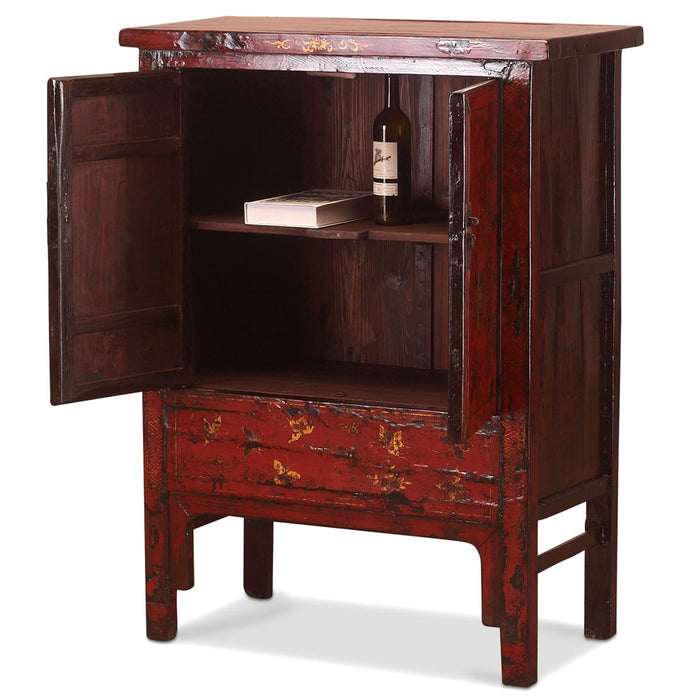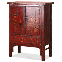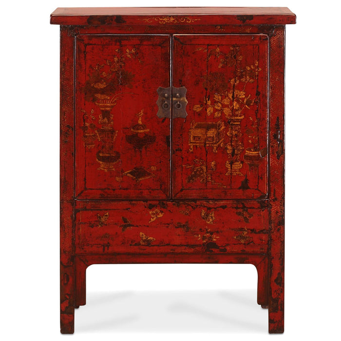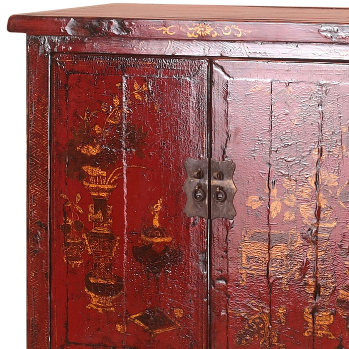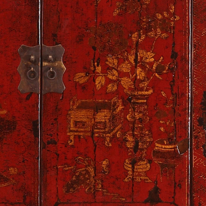 The worn, old gold paintings and deep, rich red lacquer of this cabinet would add a real warmth and vibrancy to any setting. The cabinet is from Shanxi province and is typical of the beautifully crafted painted furniture that the region is famous for in China. The gold decoration is old, though possibly retouched over the years, and shows various fine possessions - bronzes, books and vases - designed to show off the importance and status of the owner. The old red lacquer has a crackled, worn look that is full of character, though resealed and refreshed with a new shiny varnish. With a single removable shelf inside and a removable board over the bottom section, the cabinet would be perfect for storage in a living room or bedroom, or would make a great drinks cabinet.