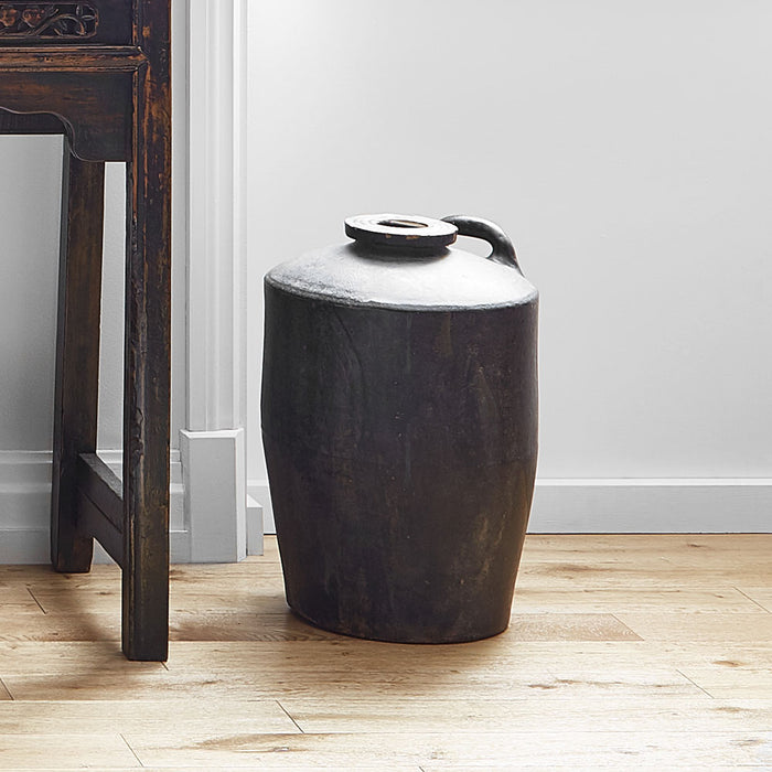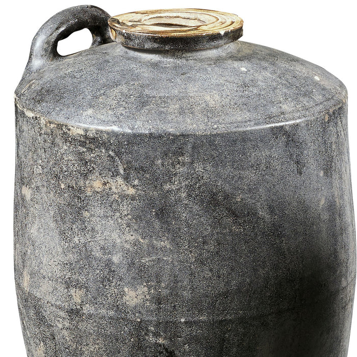These old jars date from the mid 20th century and would have been used originally to store oil. In a dark stone and with a handle, they are great as ornaments used either indoors or outside.