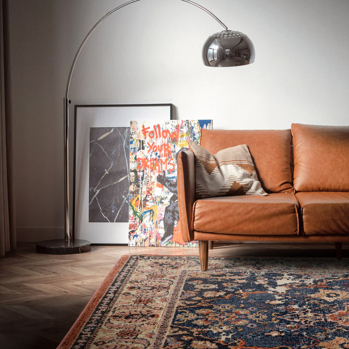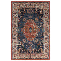 The Zola Heris rug has a traditional central medallion in dark orange, sat against a deep blue background. The entire range is machine woven in Turkey. Made from 78% polypropylene and 22% polyester. Available in three sizes.